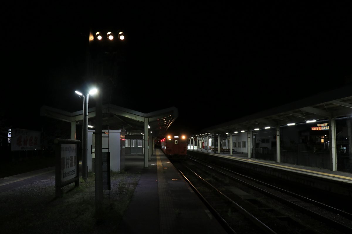 竹野駅で再び列車交換。暗闇の中、列車のヘッドライトで照らされたレールが輝く。