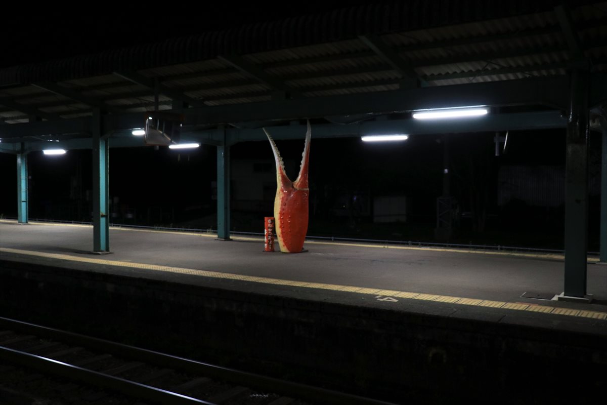 ふと窓の外を見るとホームからカニの手が生えていたので、早くも酔いが回ってきたか……と思いきや現実のようで、駅名を見てみるとカニで有名な香住。浜坂と並ぶ県北の観光地として知られた町ですが、この駅もつい最近無人駅となってしまったらしい。