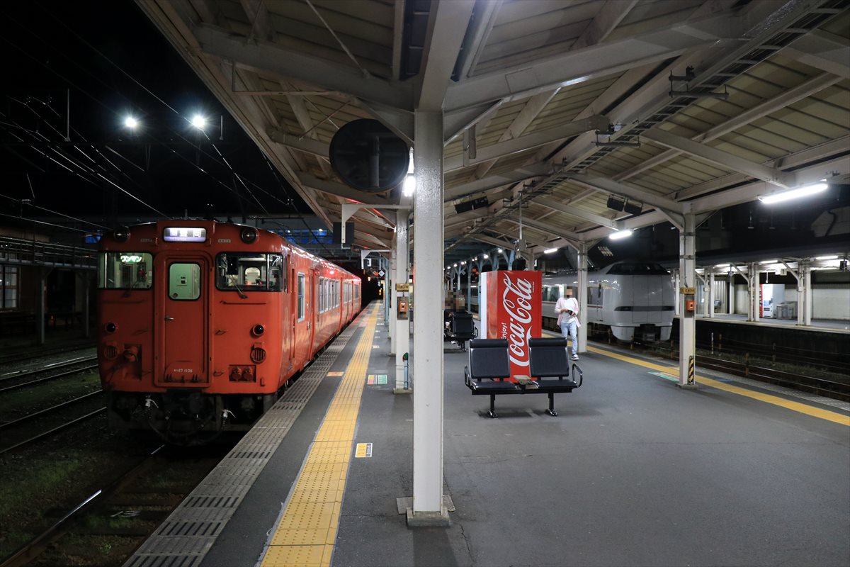 途中の岩美駅にて列車の交換待ち。当初の予定通り扇ノ山から下ってきたら岩井温泉か湯村温泉かどちらかに入るつもりで、岩井温泉に入った場合はこちらの駅に辿り着く予定でした。しかし岩井温泉内にある日帰り入浴施設が町外者お断りとの事だったので、こちらのルートは割と早い内から選択肢に外れていた。