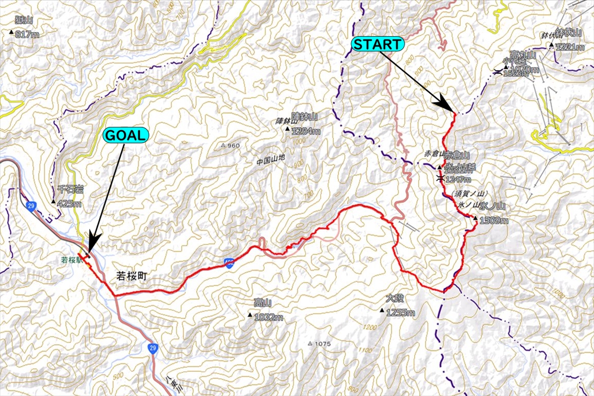 現在の赤倉山は縦走路も経由していない、夏場は藪に覆われた地味なピークですが、戦前の古い版の地形図において氷ノ山の名を冠していたのはこちらのピークでした。画像は昭和初期の版の5万分の1地形図を加工したもので、左下の氷ノ山と記載されたピークが現在の赤倉山、そして現在の氷ノ山は須賀ノ山という名で表記されています。