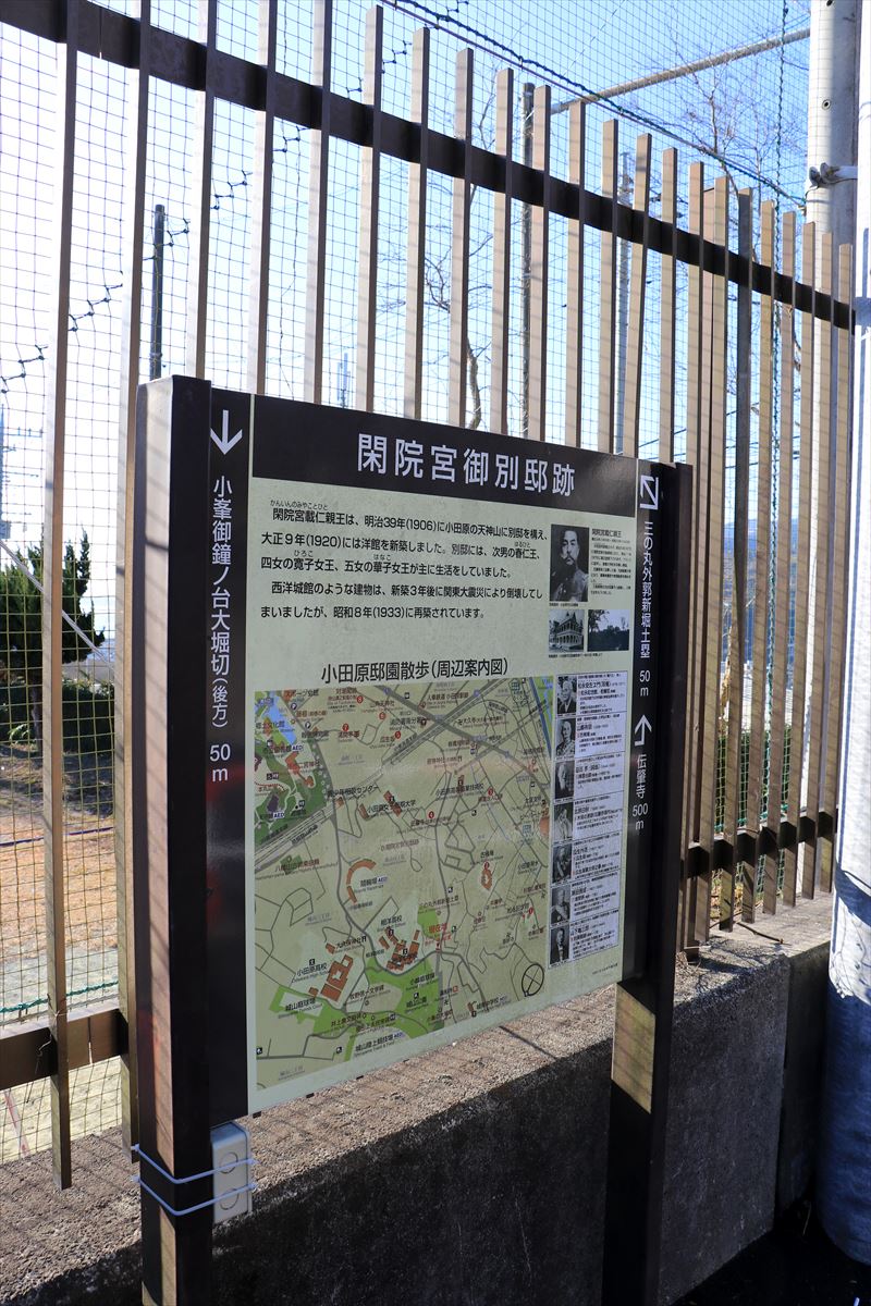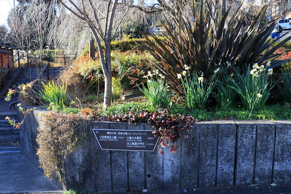 小峯御鐘ノ台大堀切と書かれた看板。小田原城には豊臣秀吉の小田原城攻めに備え、総構えと呼ばれる非常に大規模な土塁が築かれていたとされており、こちらはその遺構の一つ。