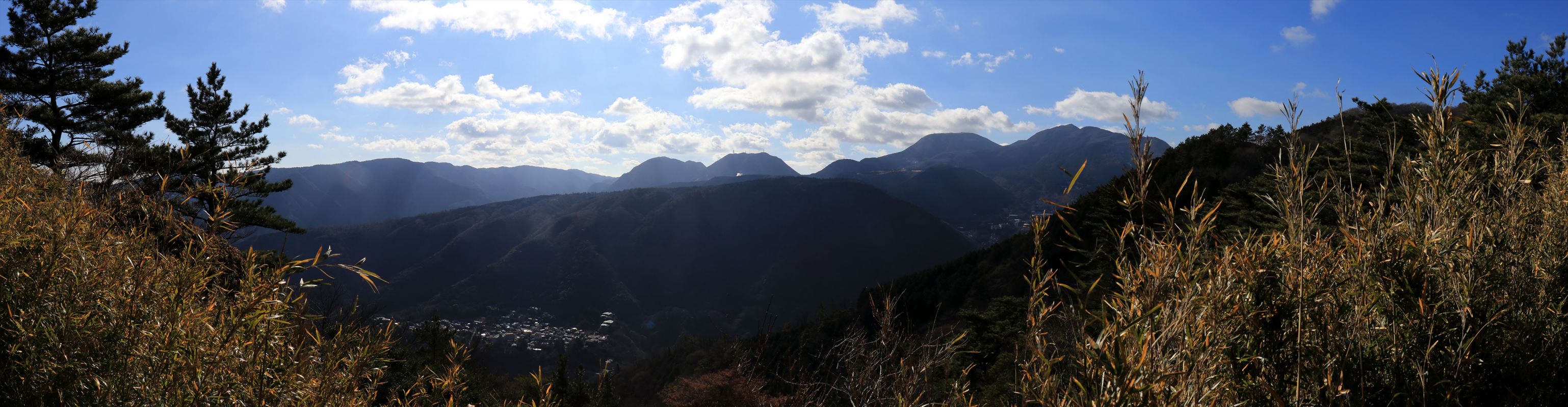 やや開けた所があったので、そこからのパノラマ。左から白銀山、二子山、駒ヶ岳、神山と並んでいる。左手前に見えるのは大平台の集落。