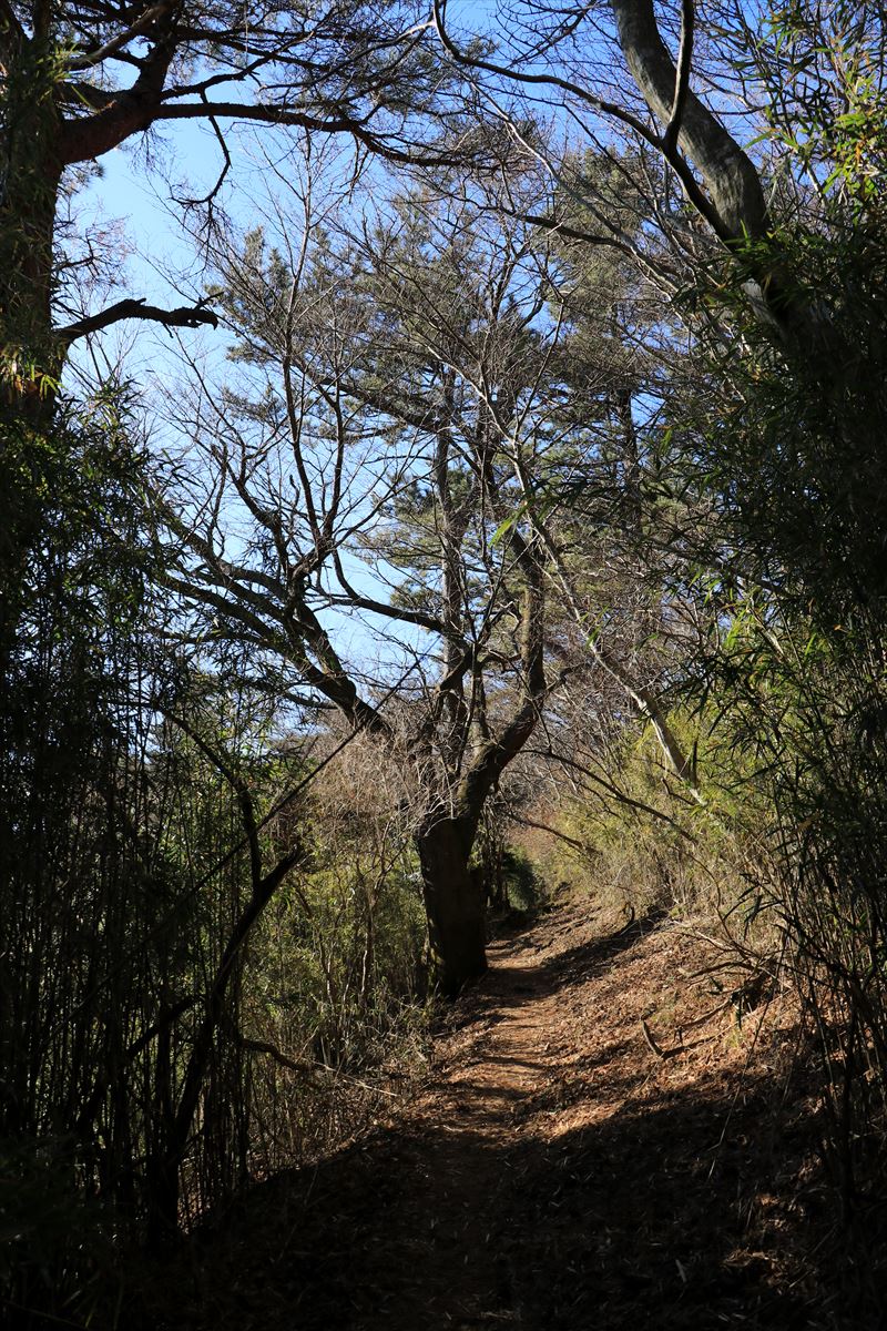 塔ノ峰の山頂へと続く登山道の様子。終始鬱蒼とした樹林帯の中の道でしたが、通る人は多いのか比較的良く整備されていました。