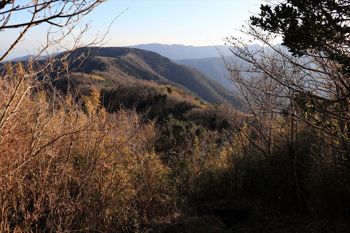 これまでは木々に遮られて見えなかった、神山から右奥の展望も見えてきました。中央に見える小高いピークが仙石原近くの台ヶ岳。その背後には翌日歩く丸岳から箱根峠方面へと続く箱根外輪山の稜線が見えています。更に奥の雲が掛かった稜線は愛鷹山でしょうか。