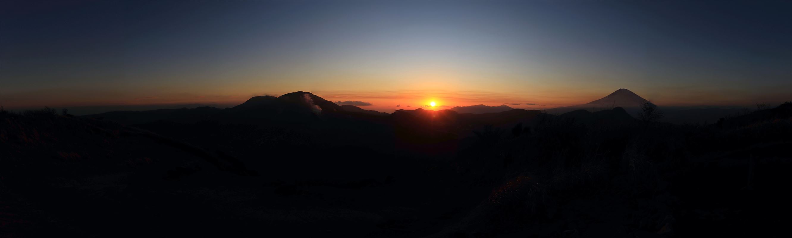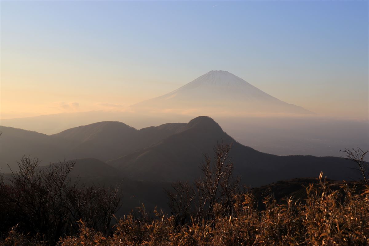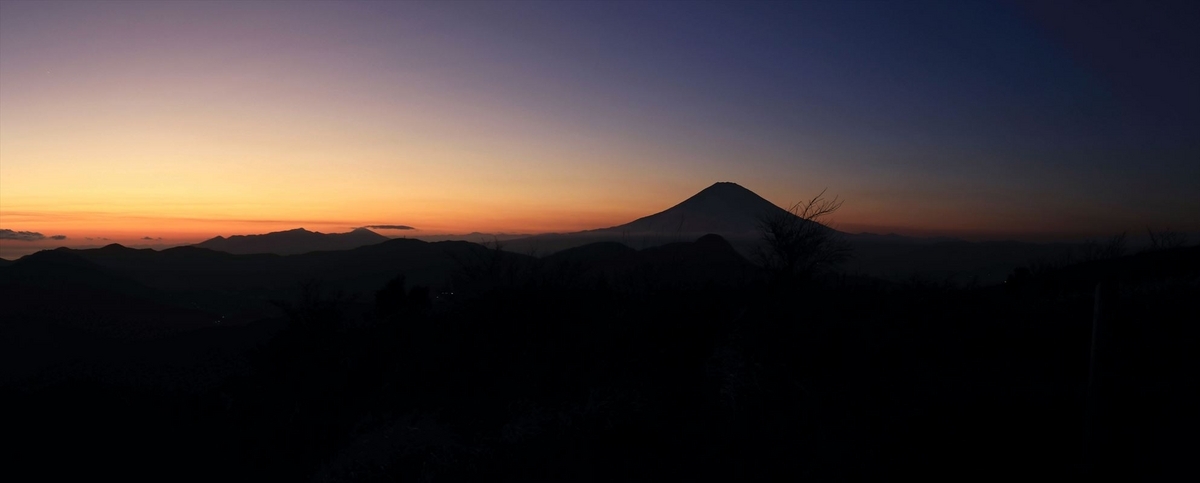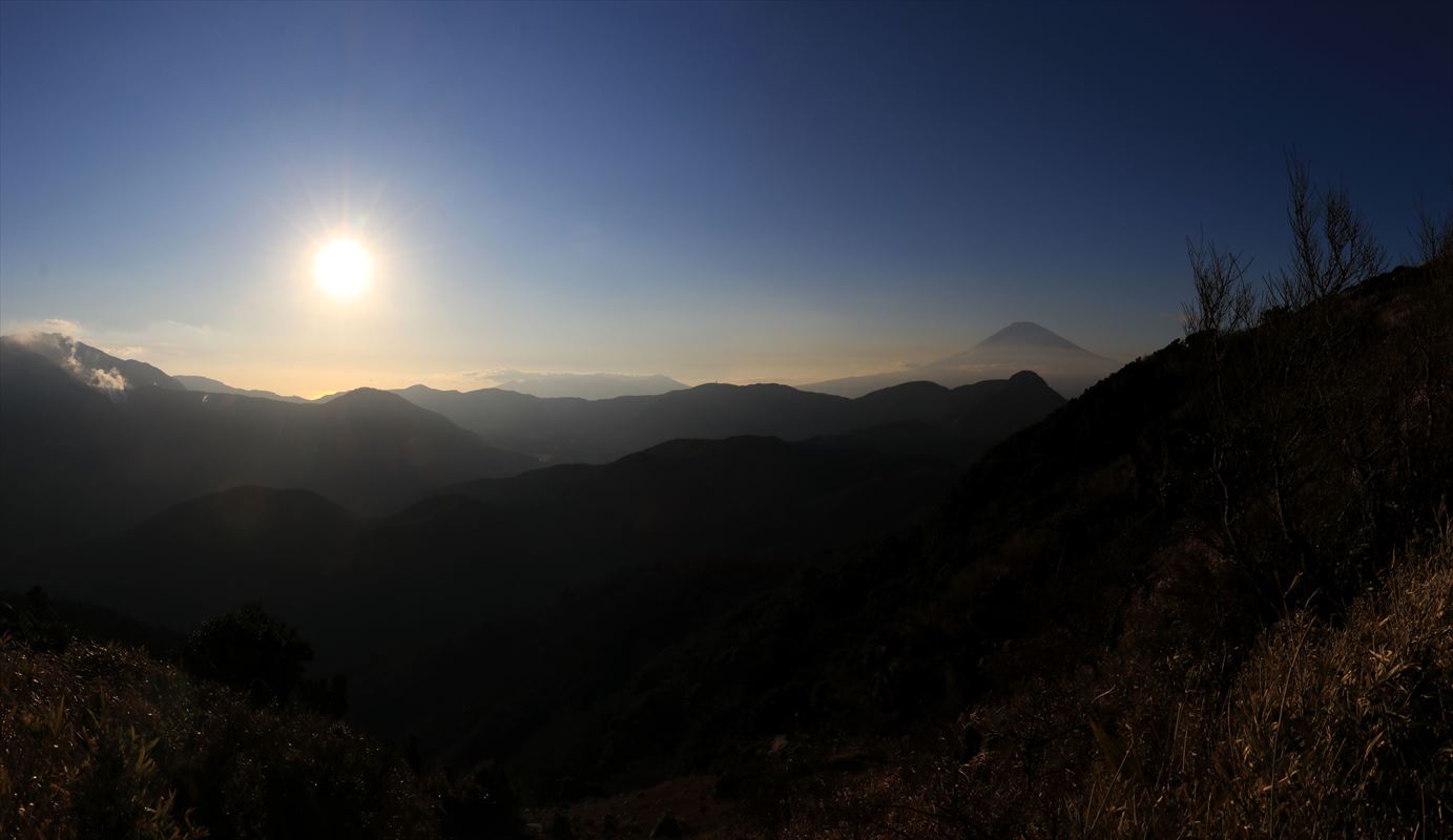 夕日と展望。北西方面、翌日向かう金時山や富士山、愛鷹山といった山々がよく見渡せました。