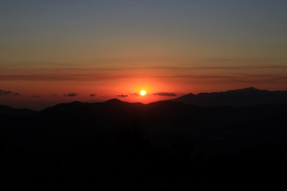日が沈んでしまった直後の周辺の様子。先程まで逆光であまり見えていませんでしたが、右側には南アルプス深南部の稜線が僅かに見えている。
