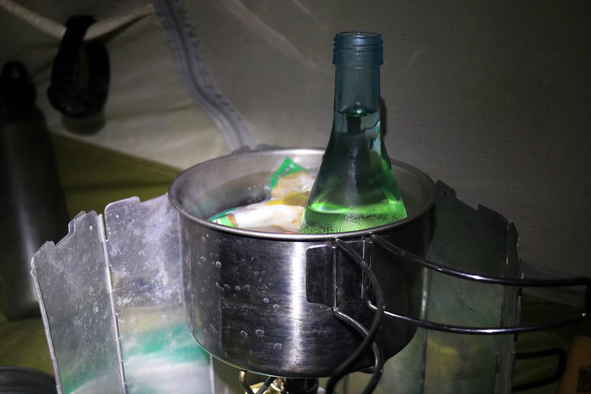夕食はおでんに燗酒と冬らしいメニュー。鍋にそのまま瓶とパックを投入して加熱。