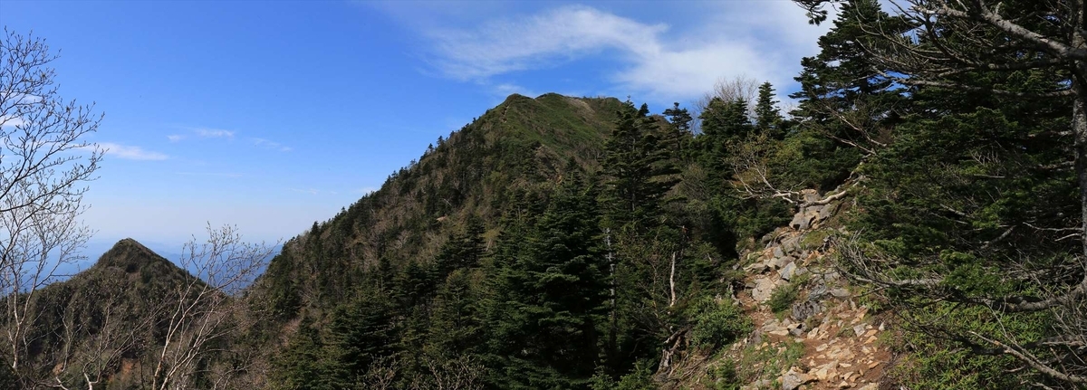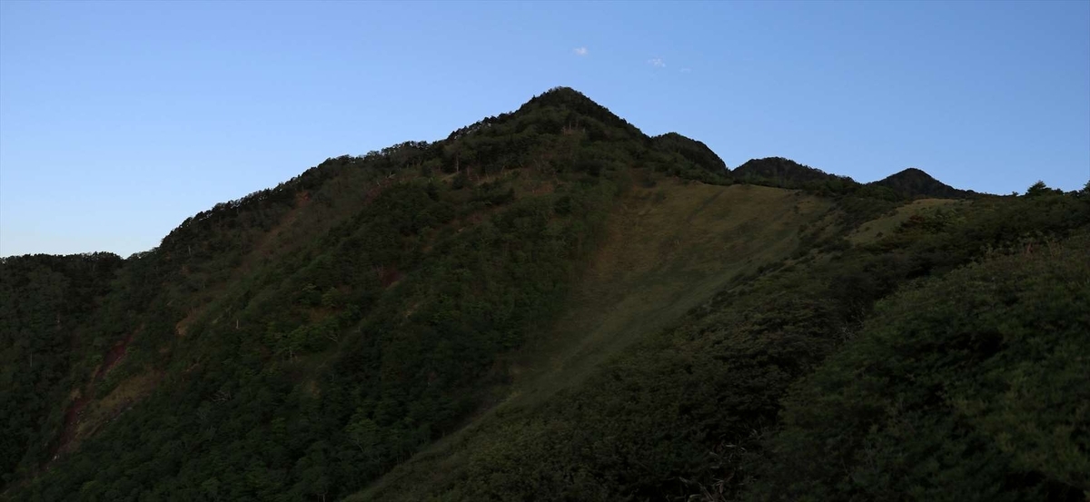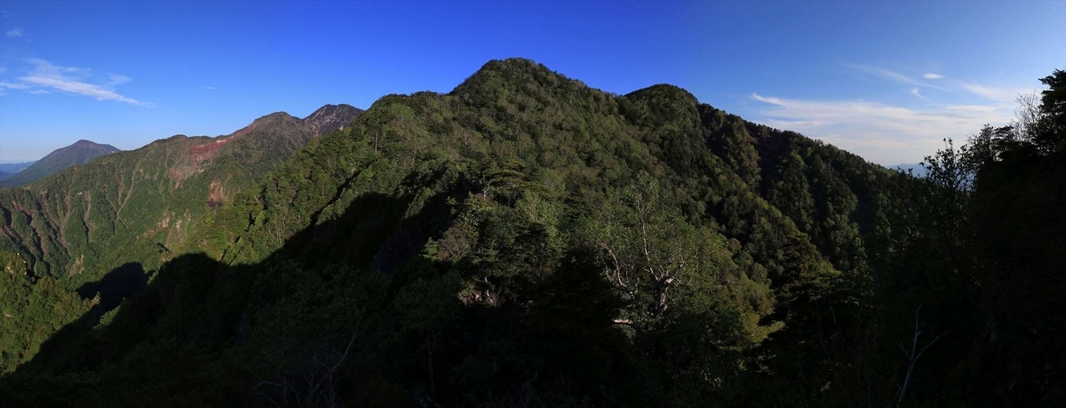 進む先を見上げた所。左側の三角形がこの日最初のピークである赤薙山です。