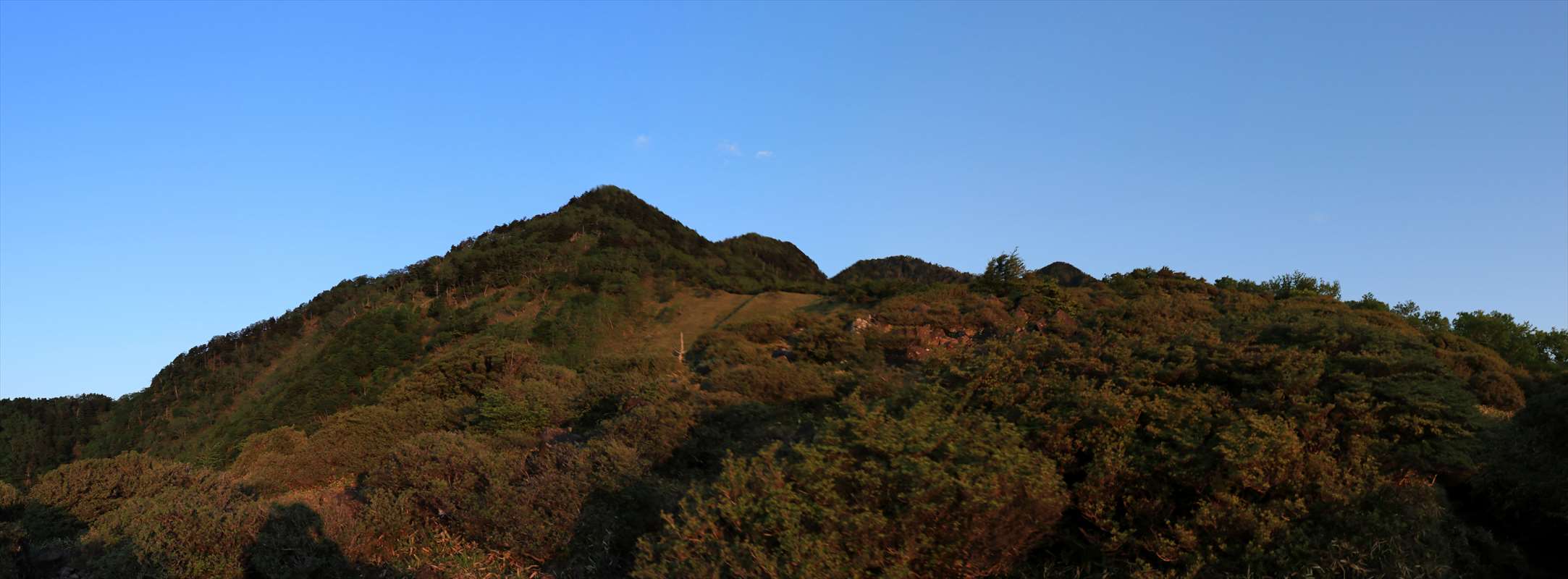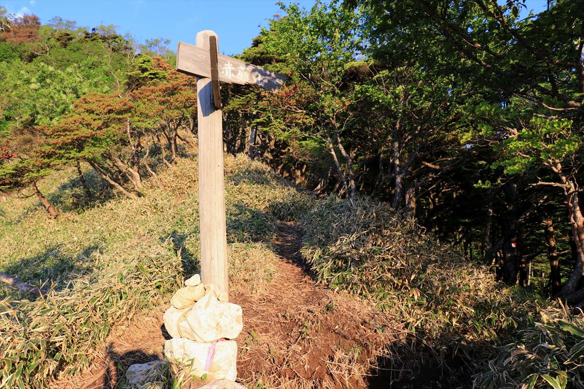 赤薙山の山頂手前の雰囲気。時間的にはまだ5時過ぎですが、振り返れば日も既に高くなっていました。