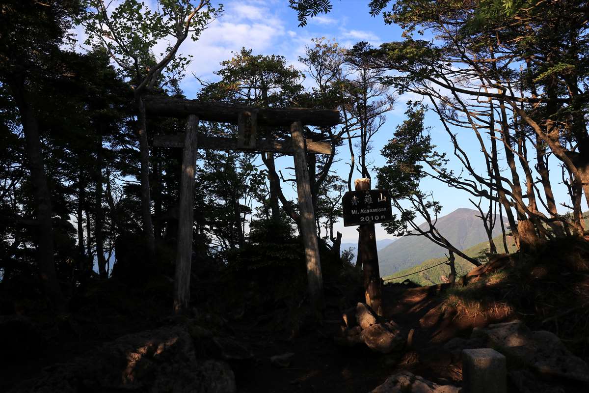 本日最初のピークである赤薙山に到着。鬱蒼とした山頂には赤薙山神社が鎮座しており、木造であるものの立派な鳥居が立つ。