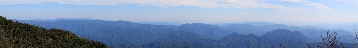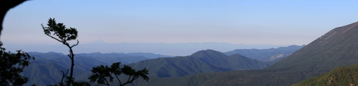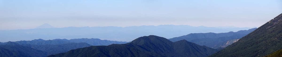 男体山の左側に見える遠くの山々を望遠で。この日も空気が澄んでおり、富士山や奥秩父山塊といった山々が鮮明に見えました。奥秩父の一番右に見える小川山の更に右奥にはかなり薄いですが南アルプスも。