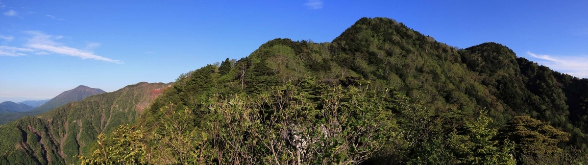 開けた所から再び女峰山。手前の鋭鋒が左に移動し、先程の三角点ピークの右の所に女峰山の山頂が見えました。更に右側には登頂後に歩く帝釈山方面の稜線も見える。