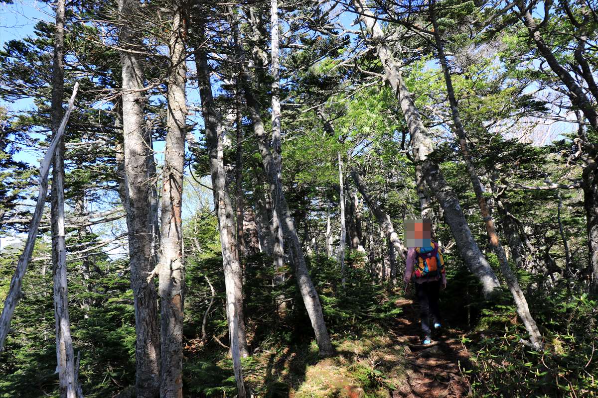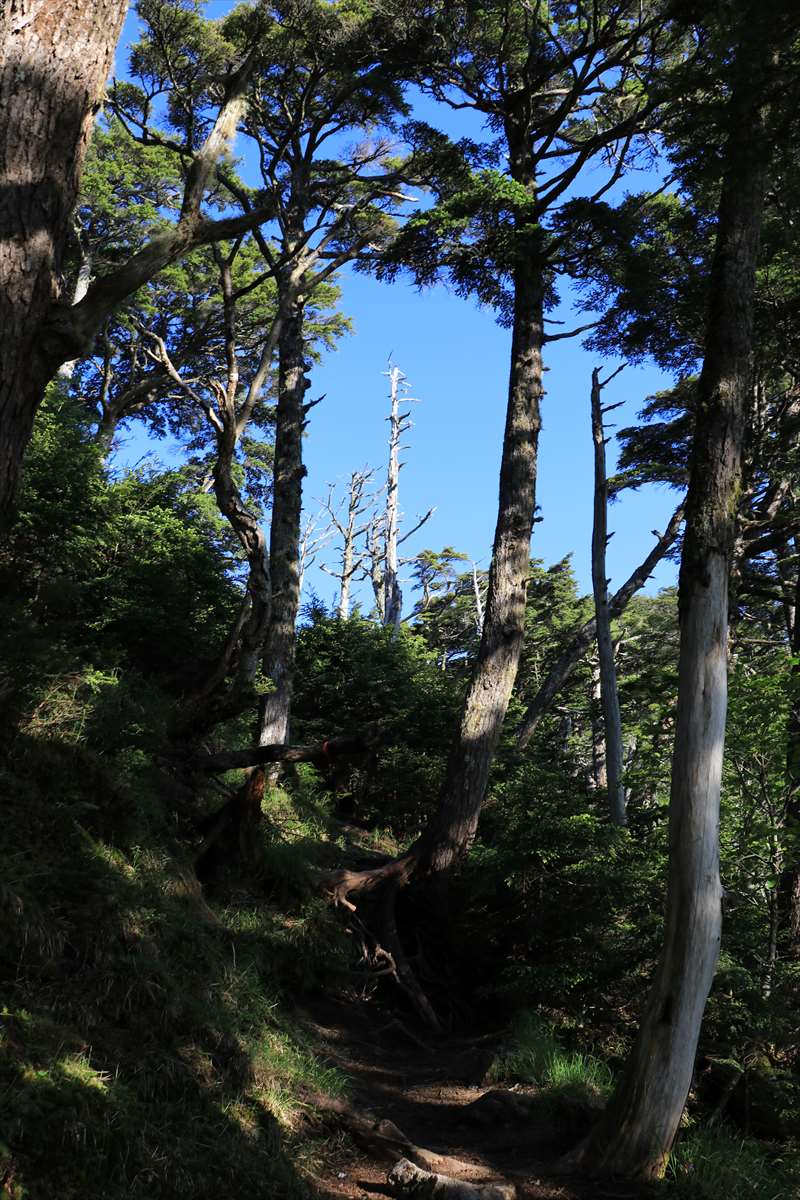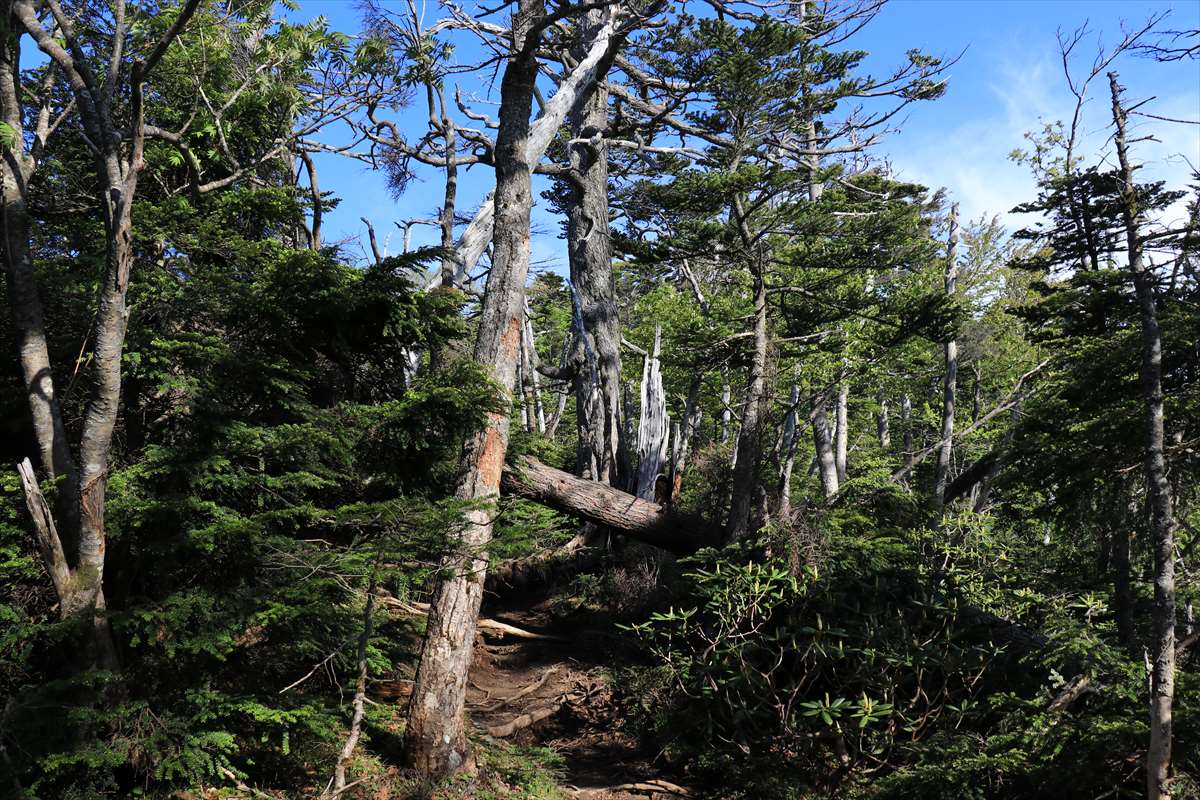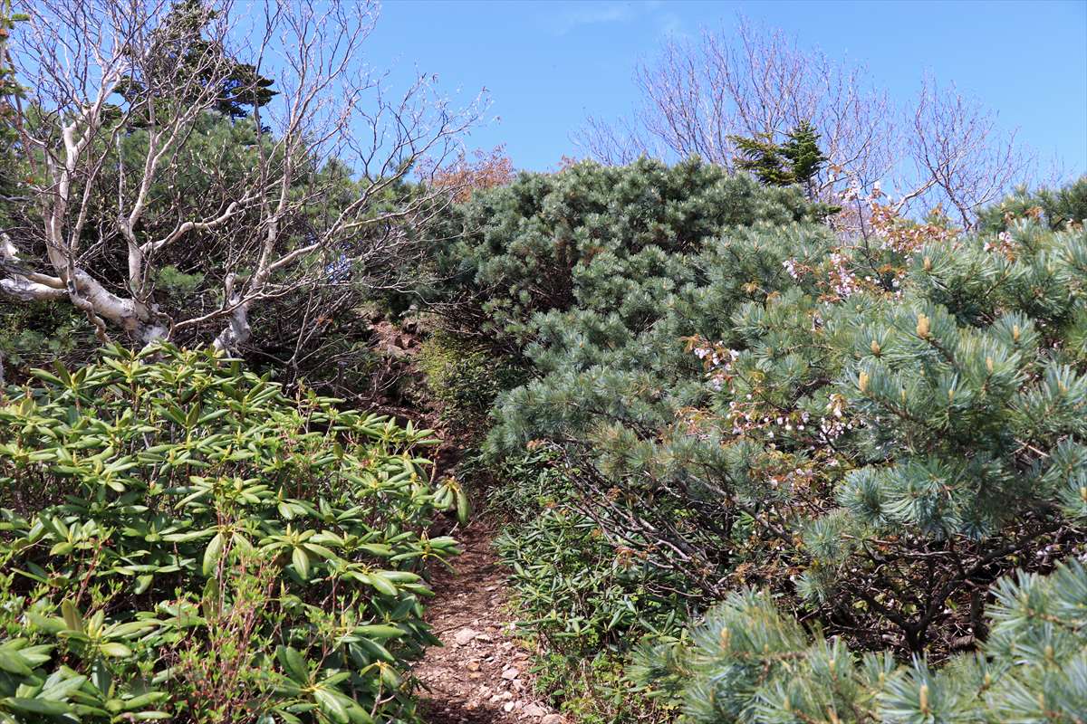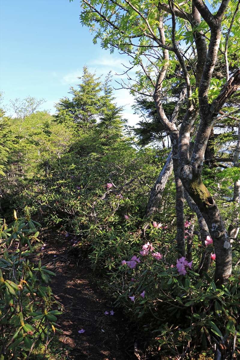 奥社跡から一度登り返して2209mピーク、それ以降は植生が変化しシャクナゲの多い道となります。