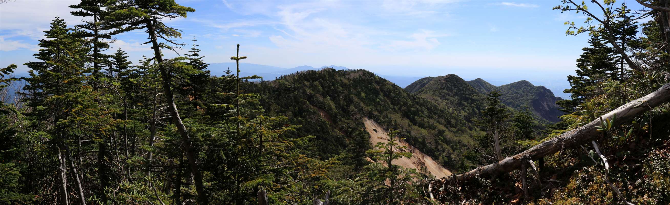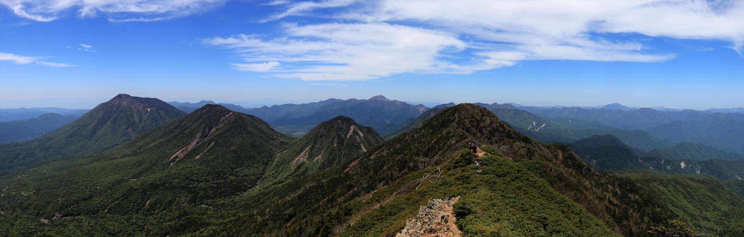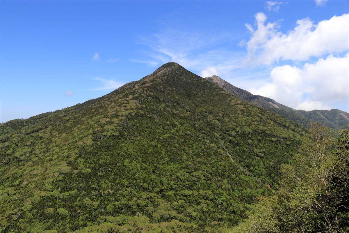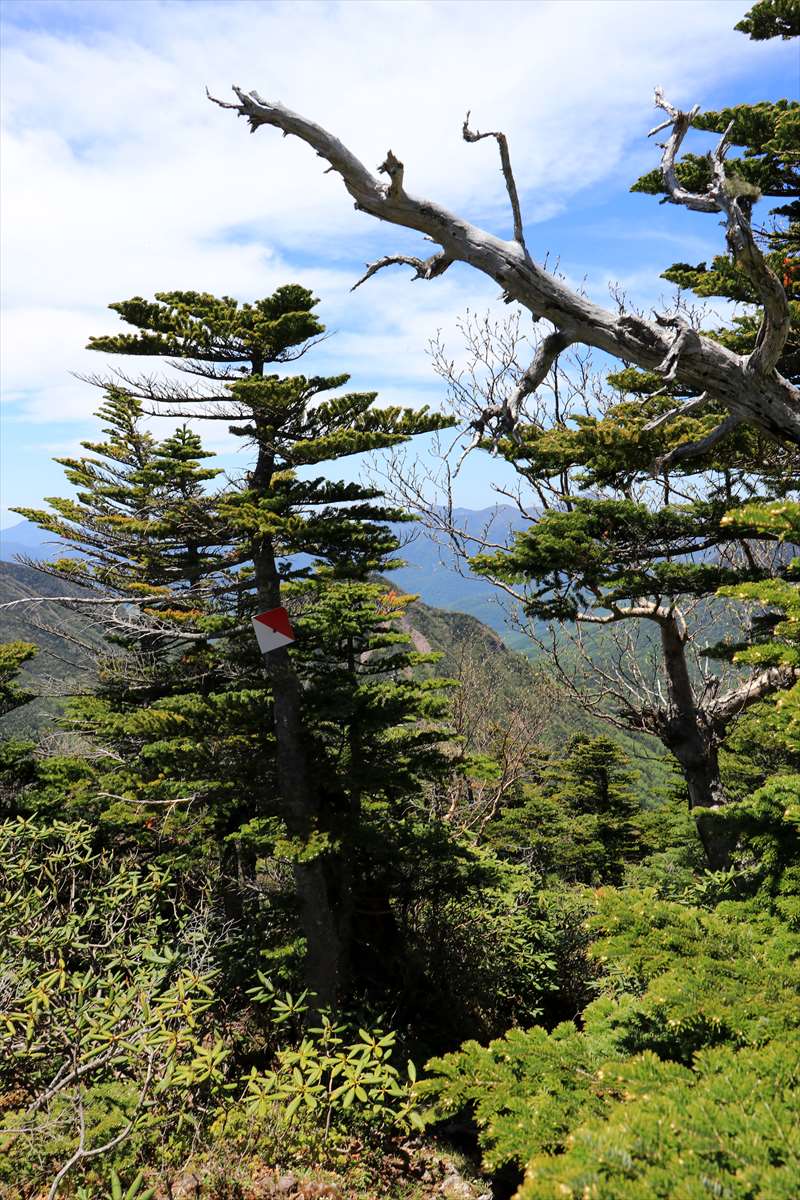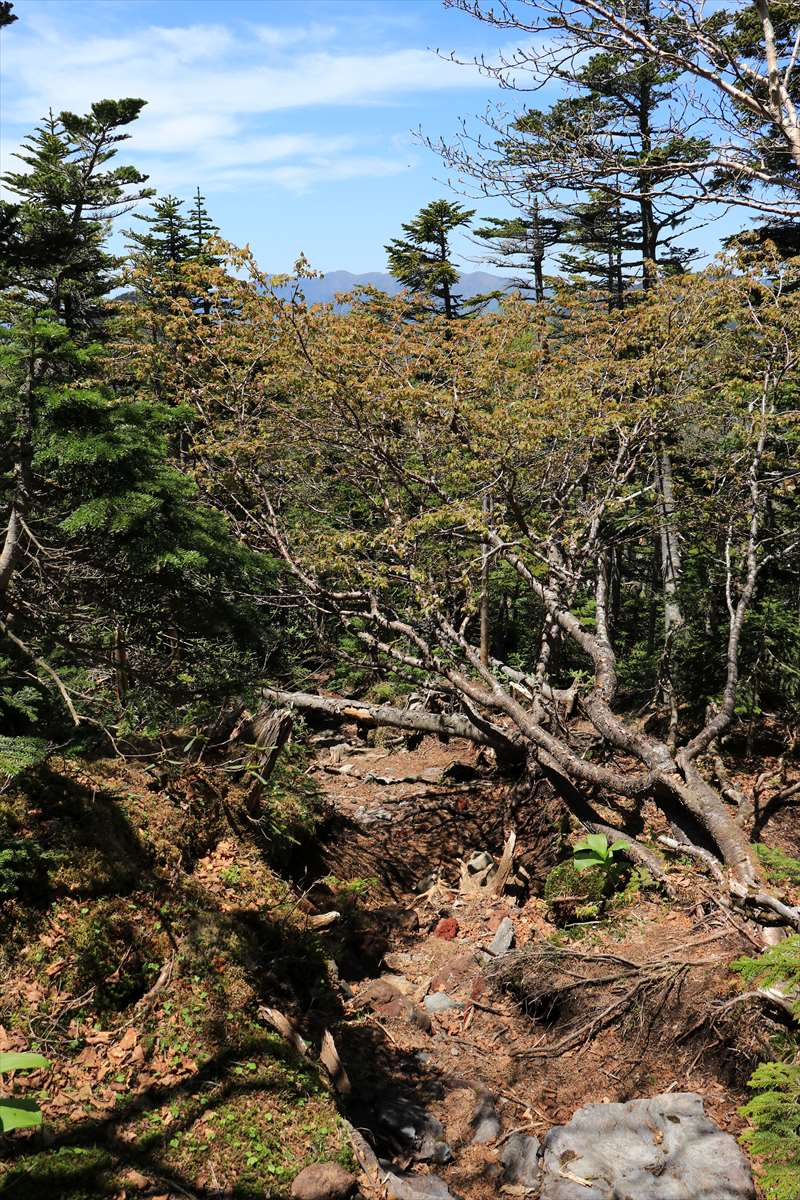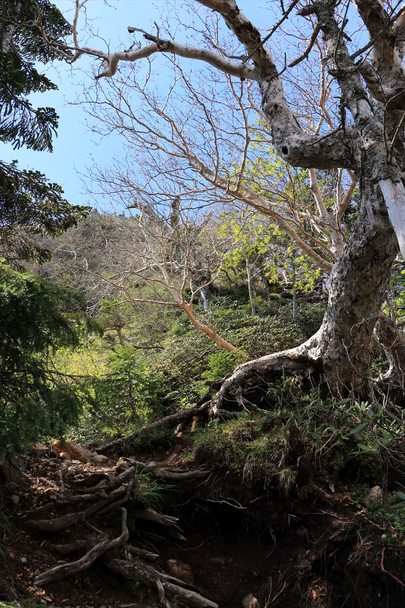険しくなってきたと同時にコース上も開けてきました。こちらは一里ヶ曽根からも見えた北方面の山々。山肌に雪が残る会津駒ヶ岳が一際目を引く。
