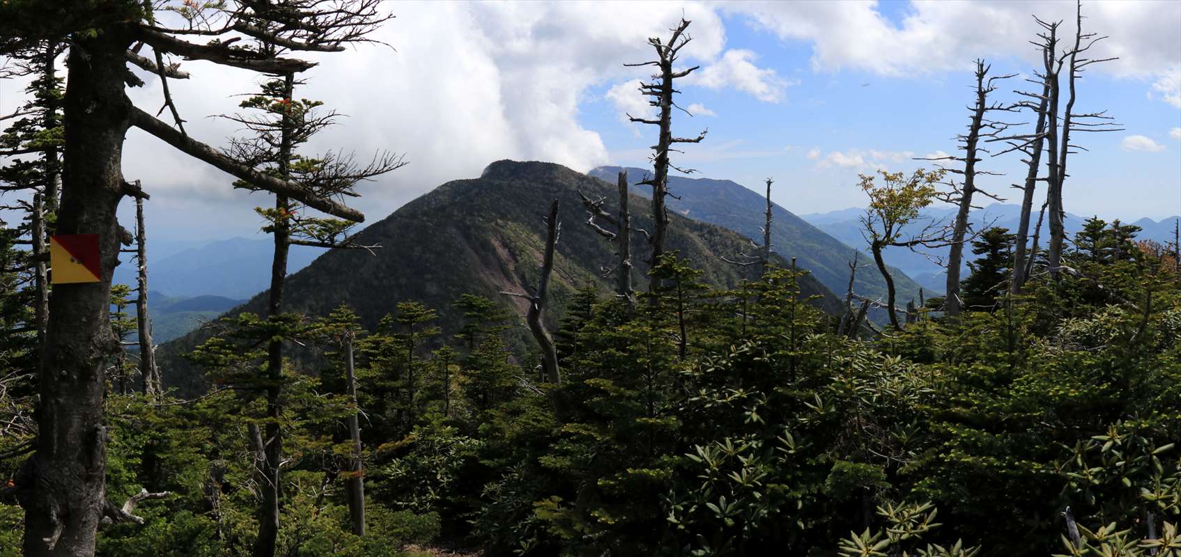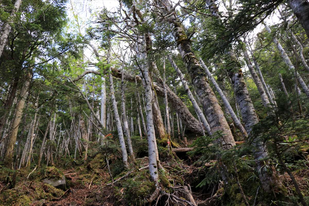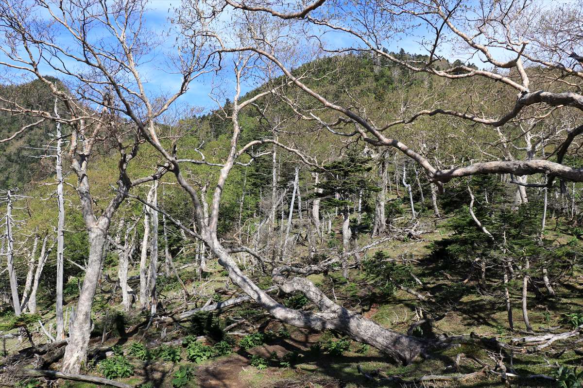 一里ヶ曽根から一旦下り鞍部付近の様子。立ち枯れした木々が多い。