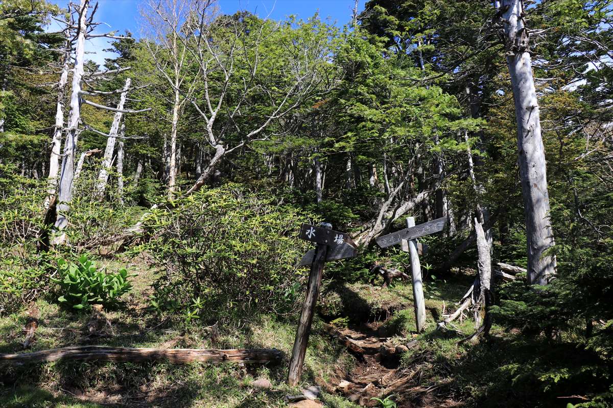 鞍部から少し登った所に水場の分岐がありました。志津避難小屋まで辿り着ければそこで汲めるのでここで敢えて汲む必要は無いのですが……水量豊富で美味しそうだったので1リットルほど汲んでおく事に。(これが後に役立つ事になる)