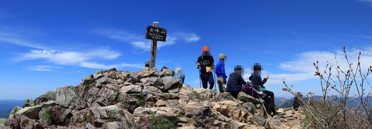 女峰山の山頂の雰囲気。予想よりだいぶ狭い山頂で、人も多く入れ替わり立ち代わりといった雰囲気でした。