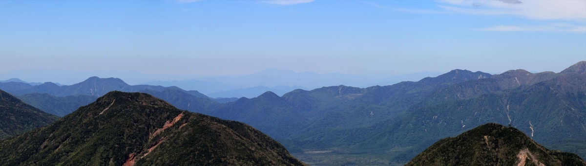 北方面の望遠。後に女峰山の山頂から山座同定しますが、燧ヶ岳や越後三山といった新潟方面の山々もよく見える……そして今回のゴールである七入は左に見える燧ヶ岳の裏側。本当に歩けるのか?と、ちょっと気が遠くなる。