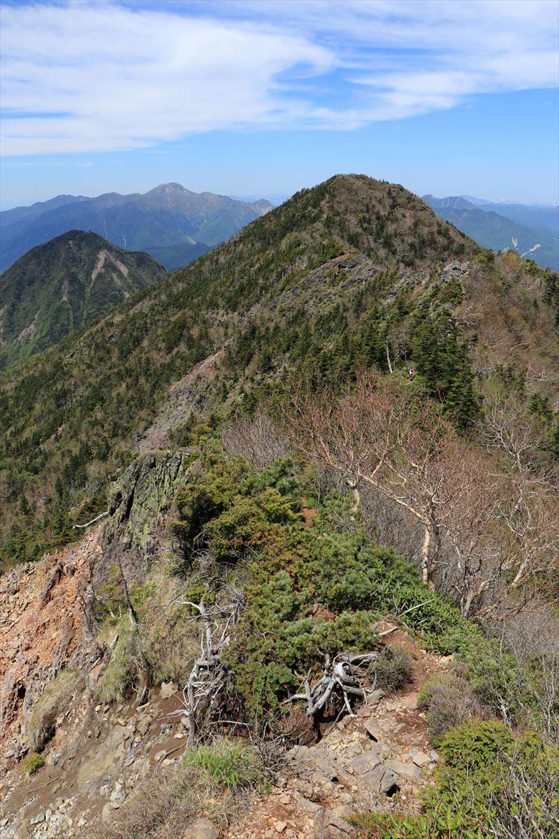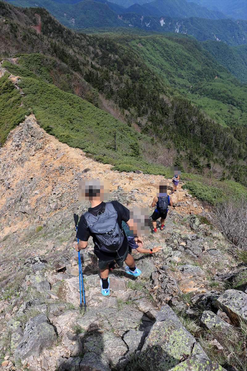 次なるピークの大真名子山を目指して進みます。鞍部の鷹の巣まで200m下り、そこから250m登るといった形。険しい。