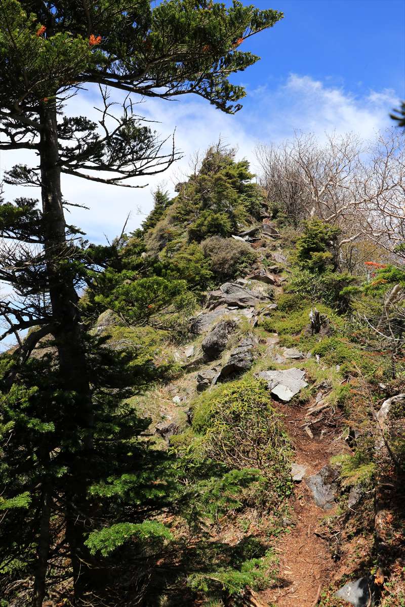 徐々に岩が増えてきた所。足元には女峰山でも見かけたツガザクラが。
