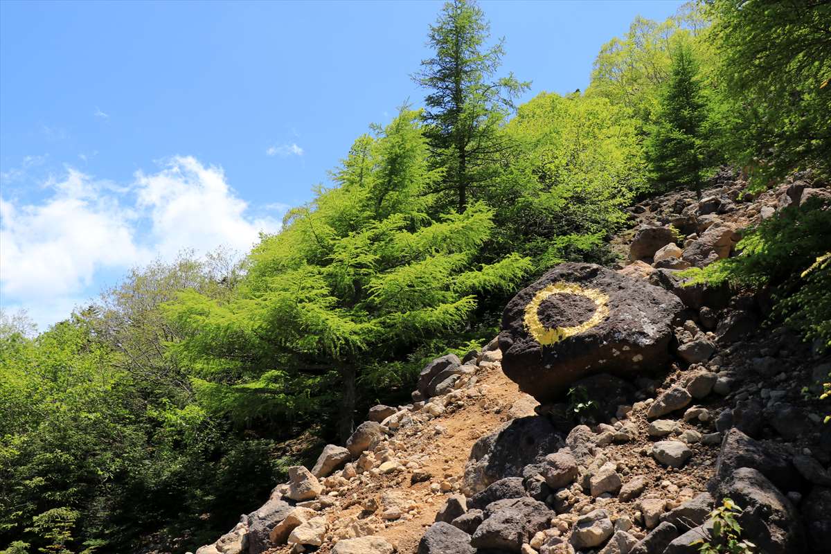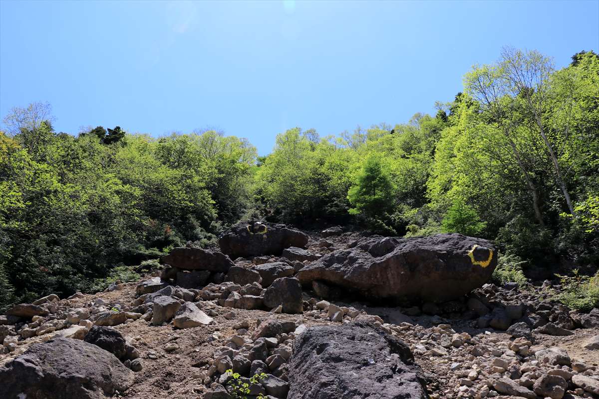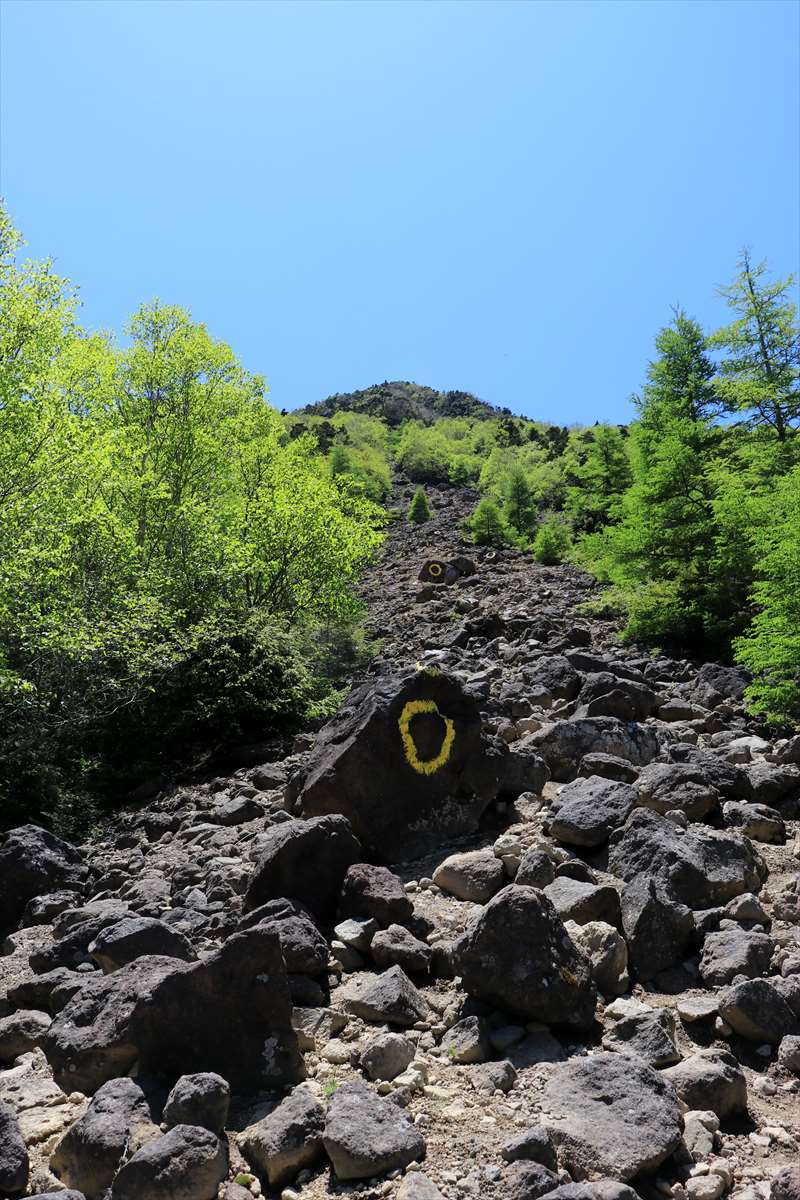 途中からガレ場となります。傾斜が急な上に浮石だらけでかなり歩きにくい……暑さも相まって過酷な登りでした。