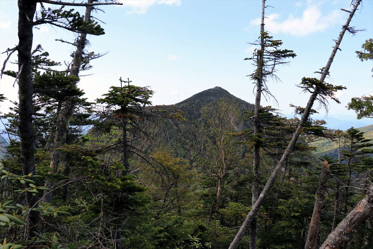 木々の途切れた所から女峰山……平坦で距離が稼ぎやすいのか、気付けば結構近付いてました。その左奥の男体山は角度的なものか鋭鋒のようにも見える。