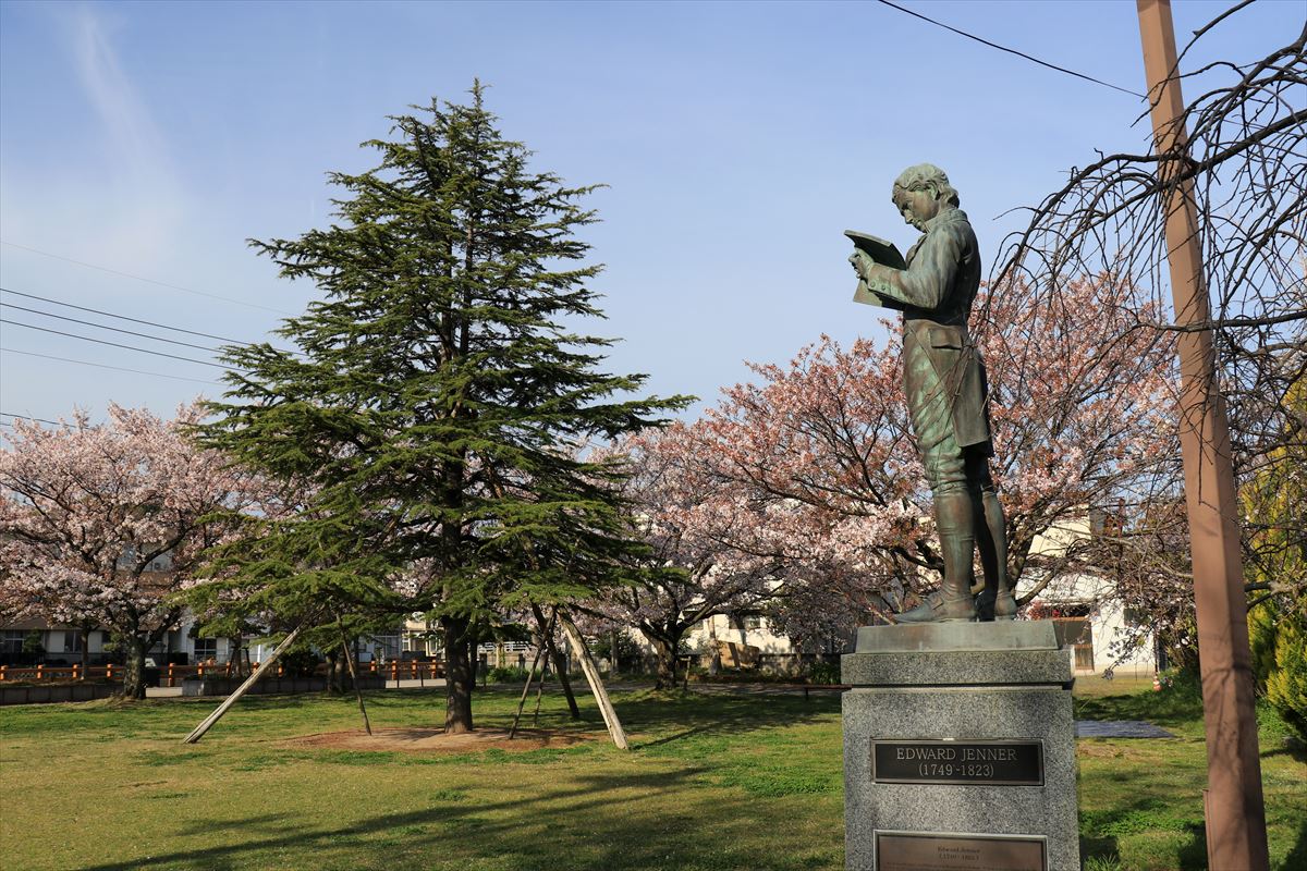 西側に進んだ所にある万灯山公園。園内には天然痘ワクチンの開発者というイギリス人医師、エドワード・ジェンナー の銅像が建つ。
