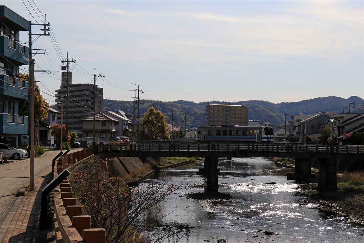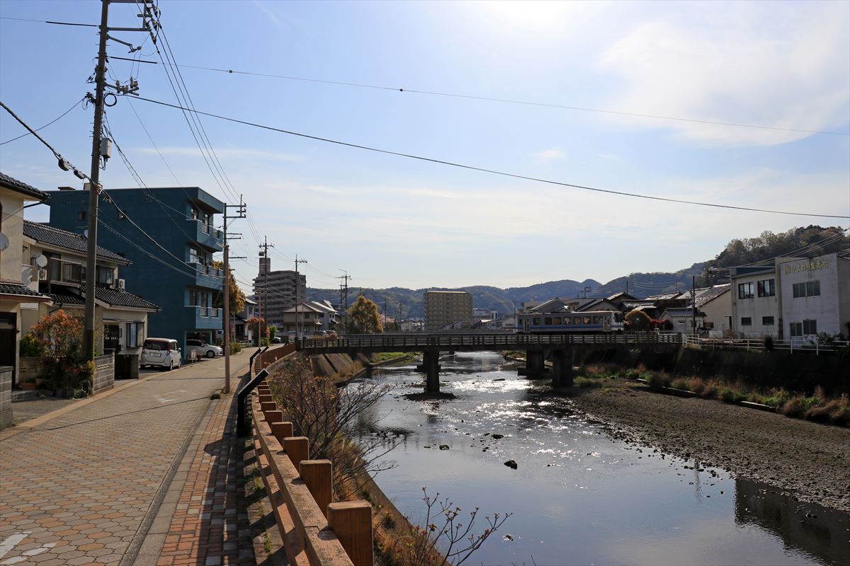 踏切の音が聞こえてきたので視線を向けると浜田川を渡る列車が見えました。乗車予定の出雲市行きの気動車のようですが、まさか車長の短いキハ120の単行とは……山陰本線も本線という名称が有名無実化して久しいですが、なんだか来る度に寂れてる気がします。