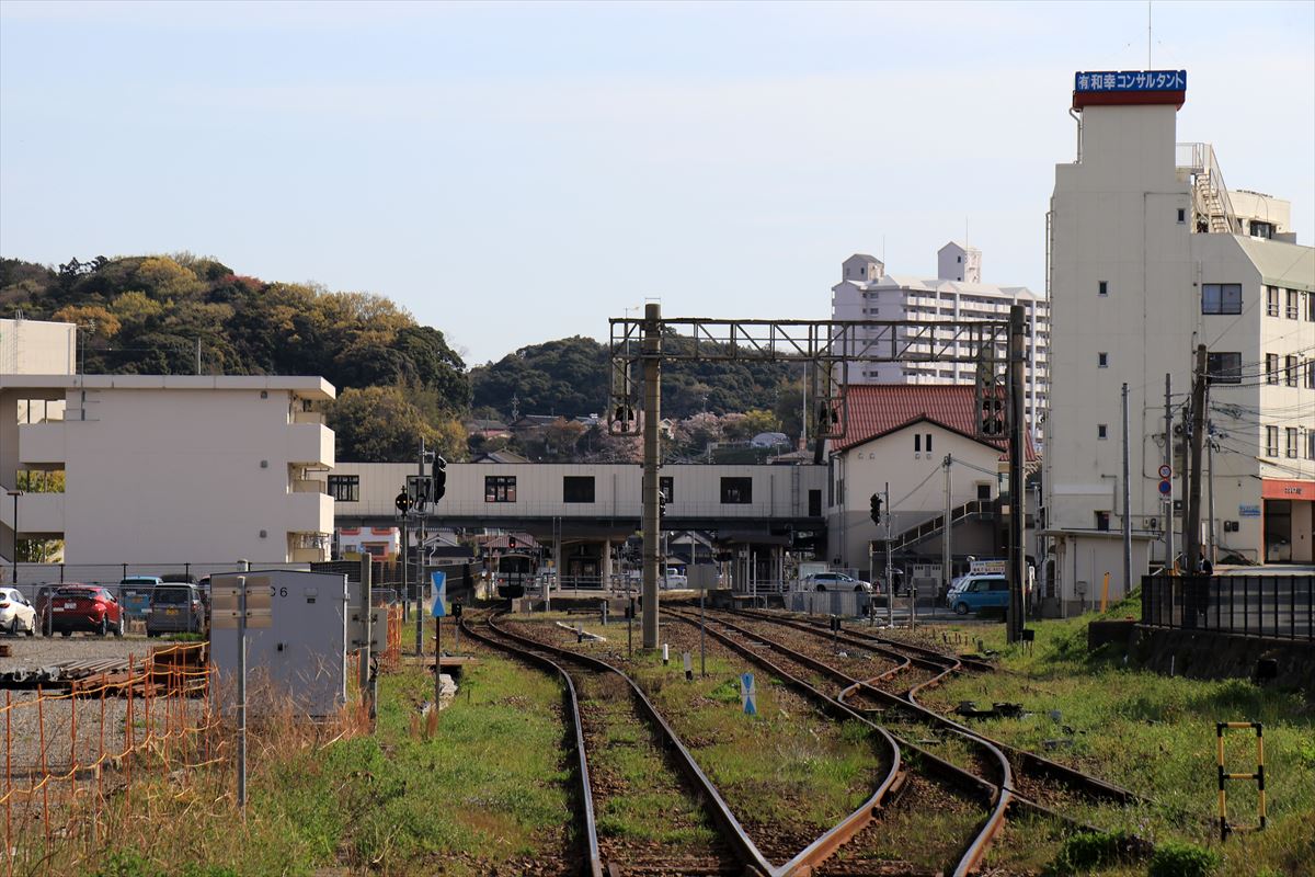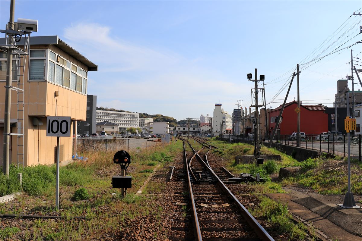 浜田駅に戻る途中、西側の踏切から駅の構内を臨む。本線系統の主要駅の割にはコンパクトな構造ですが、現在の駅舎となる前は駅裏となる左側には留置線が広がっていました。現在でも山陰本線の島根県西部区間を管轄する浜田鉄道部が駅構内に置かれ、駅の北側にはこの周辺では比較的規模の大きい車両基地が置かれている。