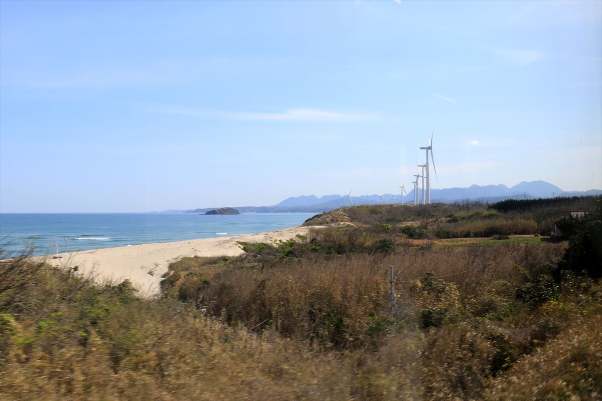 浜田駅を出発した山陰本線の列車は日本海に沿って東に進む。海沿いを走るので風光明媚な車窓が続きます。