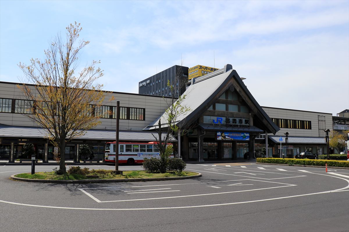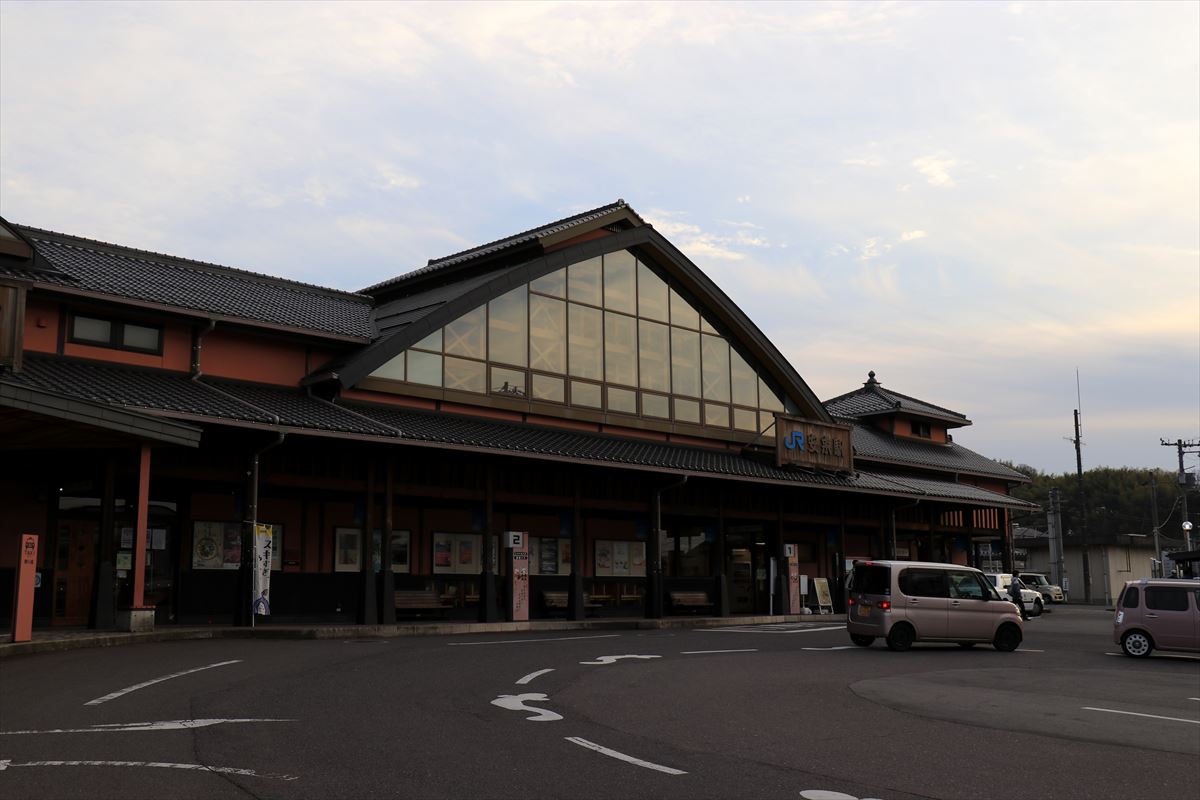 安来駅の外観。安来市の中心駅で特急も停車するからか大きめの駅舎です。内部には観光案内所も入っていますが、レンタサイクルは駅前の駐輪場の方に受付があります。