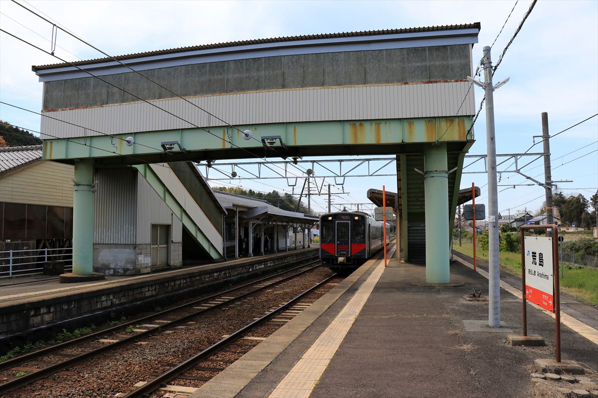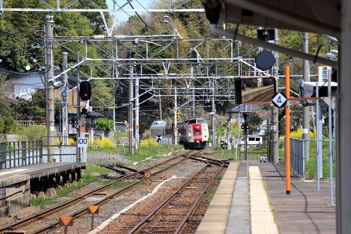 荒島駅にて特急スーパーまつかぜとの交換……ホーム端には撮り鉄の方がいらっしゃったので邪魔にならないように後方から。この駅は一線スルー型の配線の為か、スピードを維持したまま駆け抜けていく。
