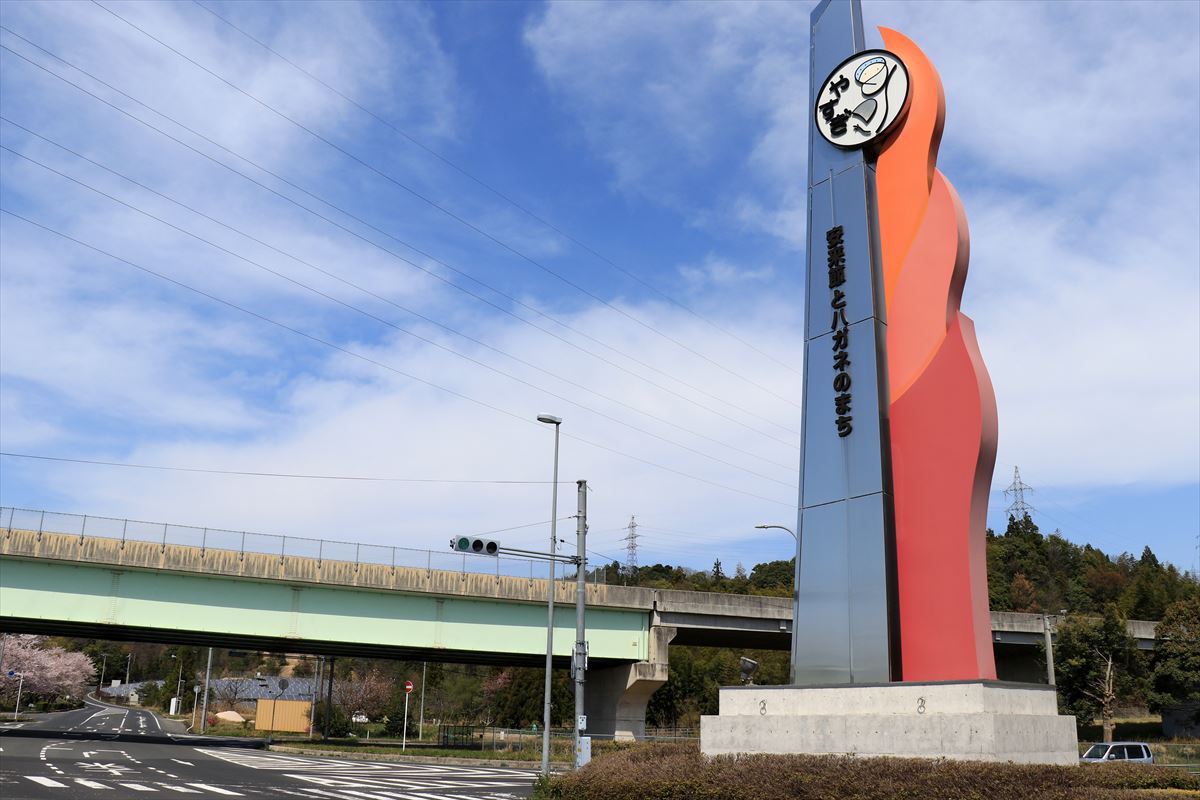 更に南に進んでいくと家並みを抜けて田畑が広がる長閑な風景に。高速のインター近くのモニュメントには安来節とハガネのまちとあります。