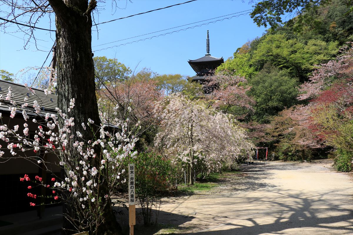 三重塔へ向かう途中はちょっとしたお花見スポット。様々な品種の桜が植えられており、それぞれ見頃を迎えていました。