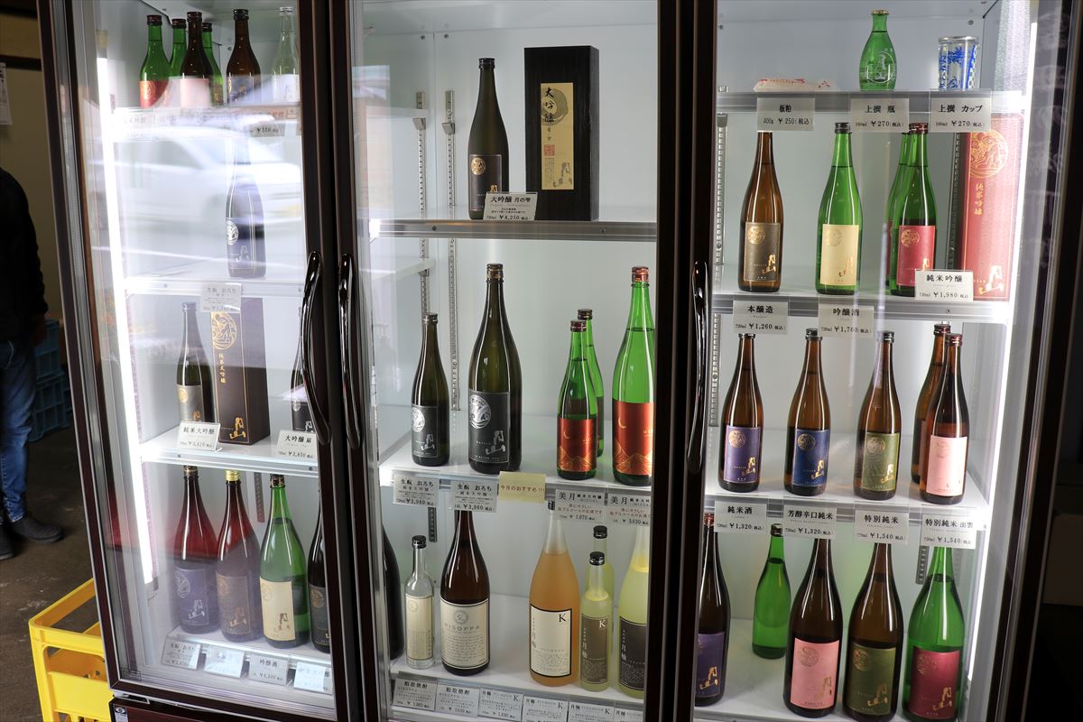酒蔵内の冷蔵ケースのラインナップ。蔵元だけの限定酒みたいなものはありませんでした。月山は近所にも取扱店があるので敢えて旅先で買う必要は無いかなと、この時はお酒を眺めただけで立ち去りました……この時は。