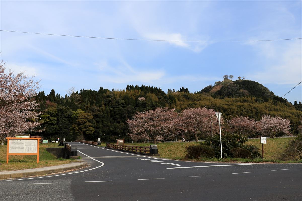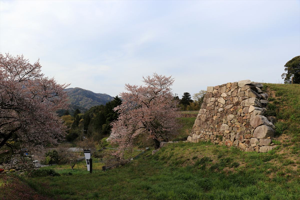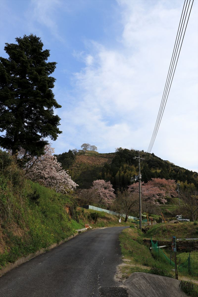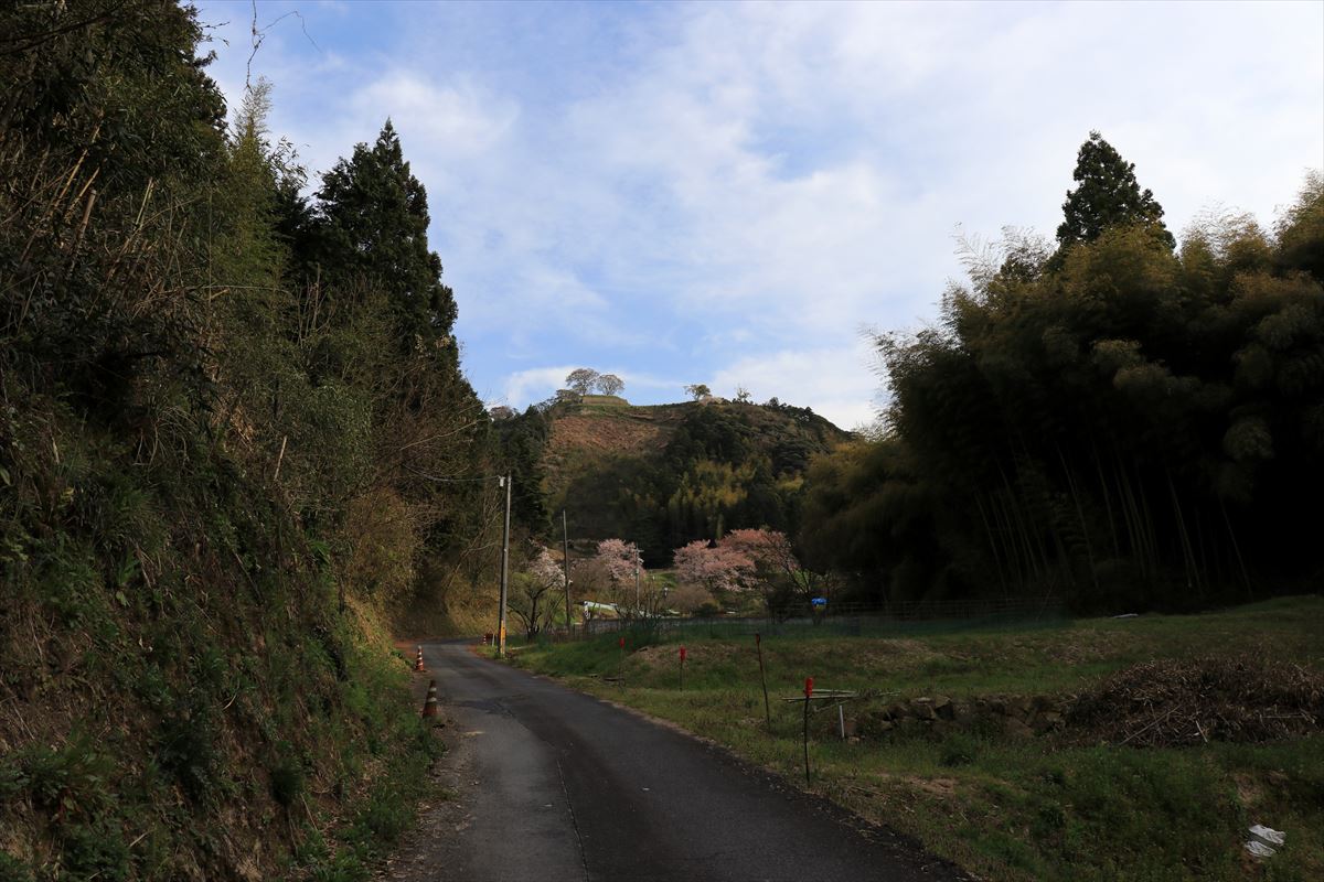 桜の花と月山富田城。駐輪場に自転車を置き、ここからは歩きです。