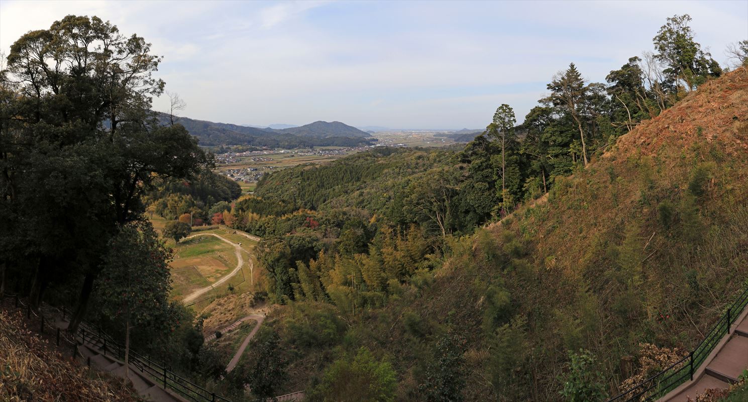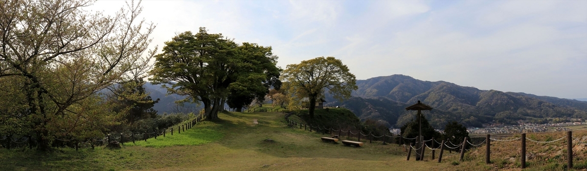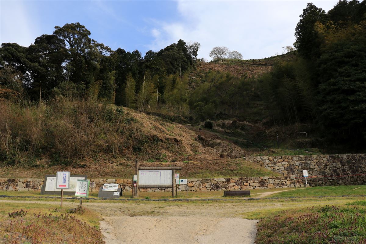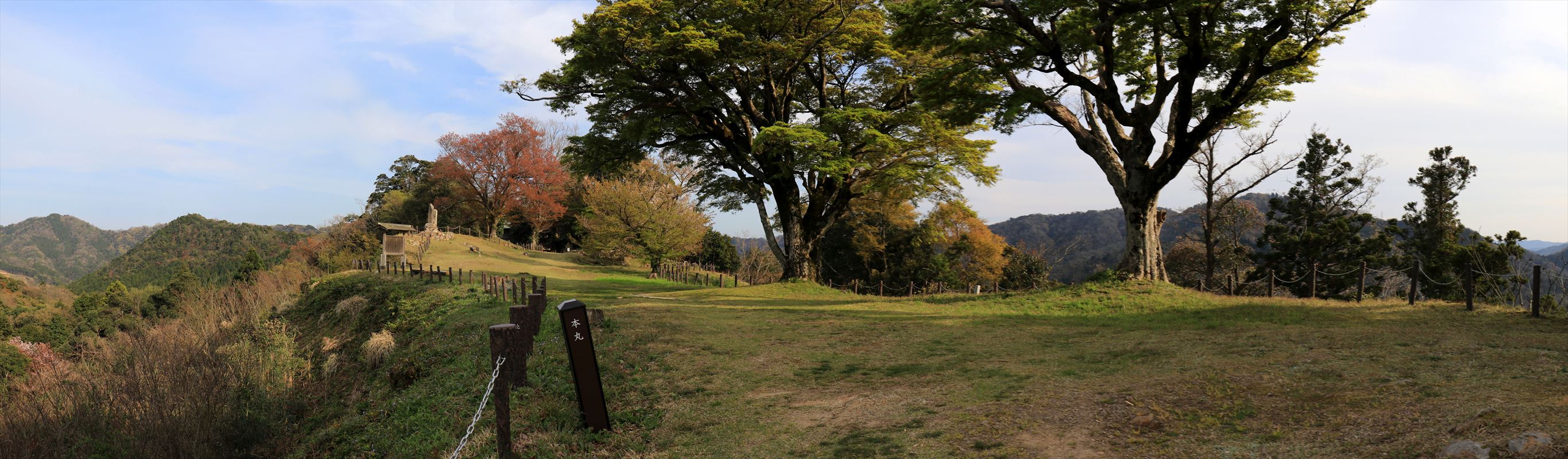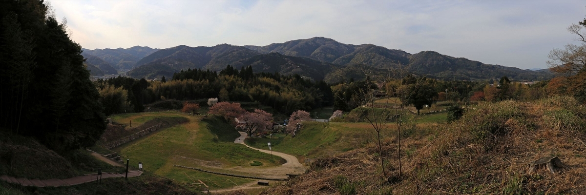 七曲りの坂を少し登ったところからの展望。広々とした山中御殿跡の先には花の壇の曲輪が見える。