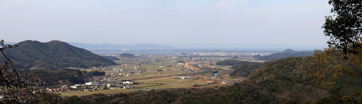 同方面を望遠してみた所。左下に先程通過した足立美術館が見えます。奥の方には中海、弓ヶ浜半島、美保湾、島根半島と交互に陸地が続いているのが確認できますね。