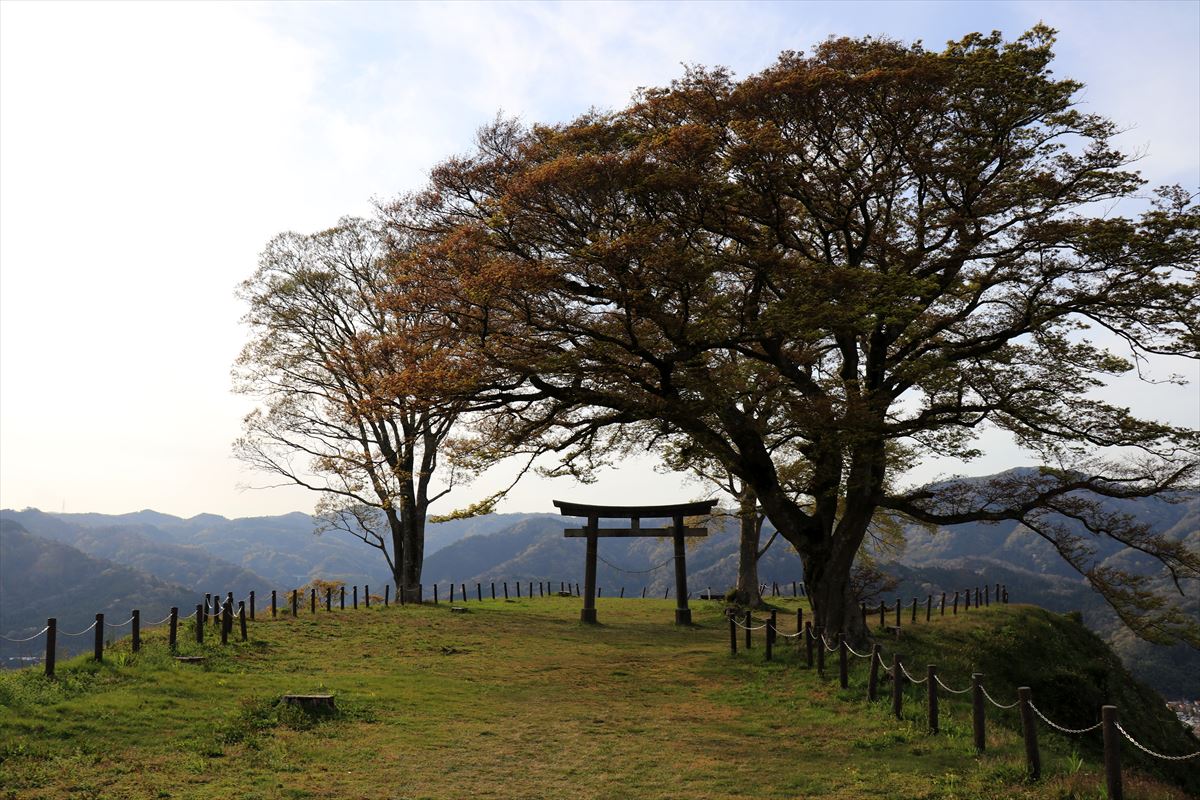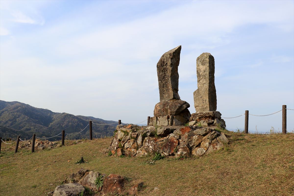 本丸に建つ山中幸盛(山中鹿介)塔。山中鹿助といえば戦国時代、主君である尼子家が毛利家によって攻め滅ぼされた後、主家再興を目指す尼子再興軍を率いて奮闘した武将として知られる。