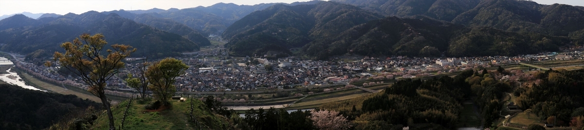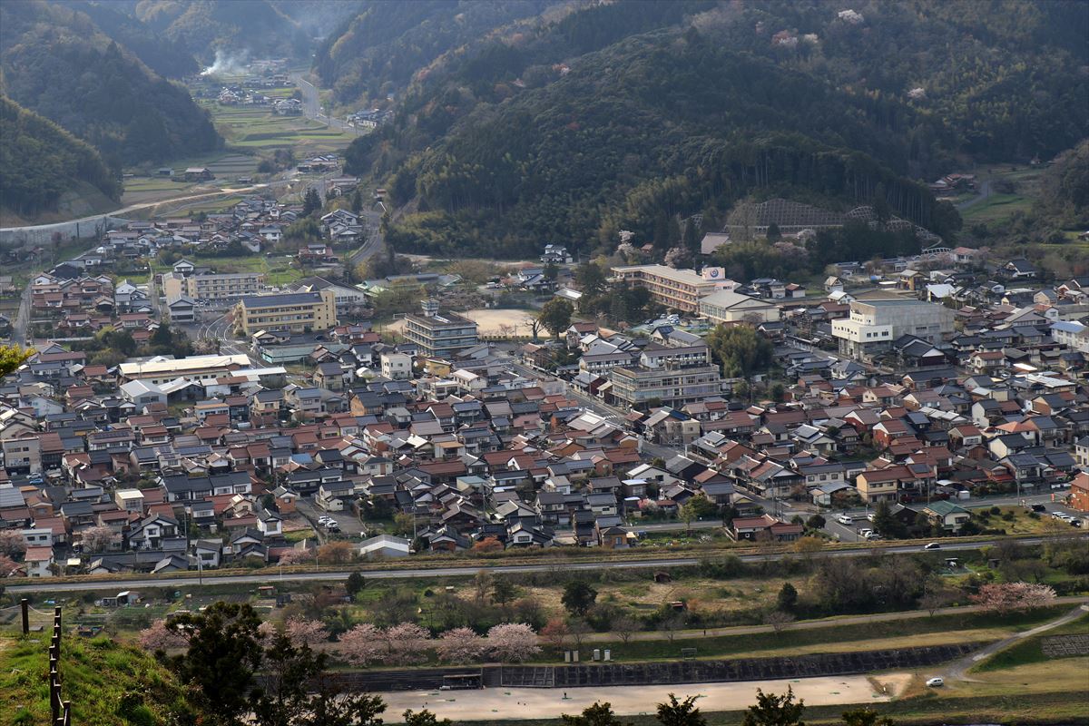 広瀬の町並みを望遠してみたもの。谷間すっぽりと収まるかのように家並みが広がっています。市街地右側の煙突がある建物が先程立ち寄った吉田酒造です。