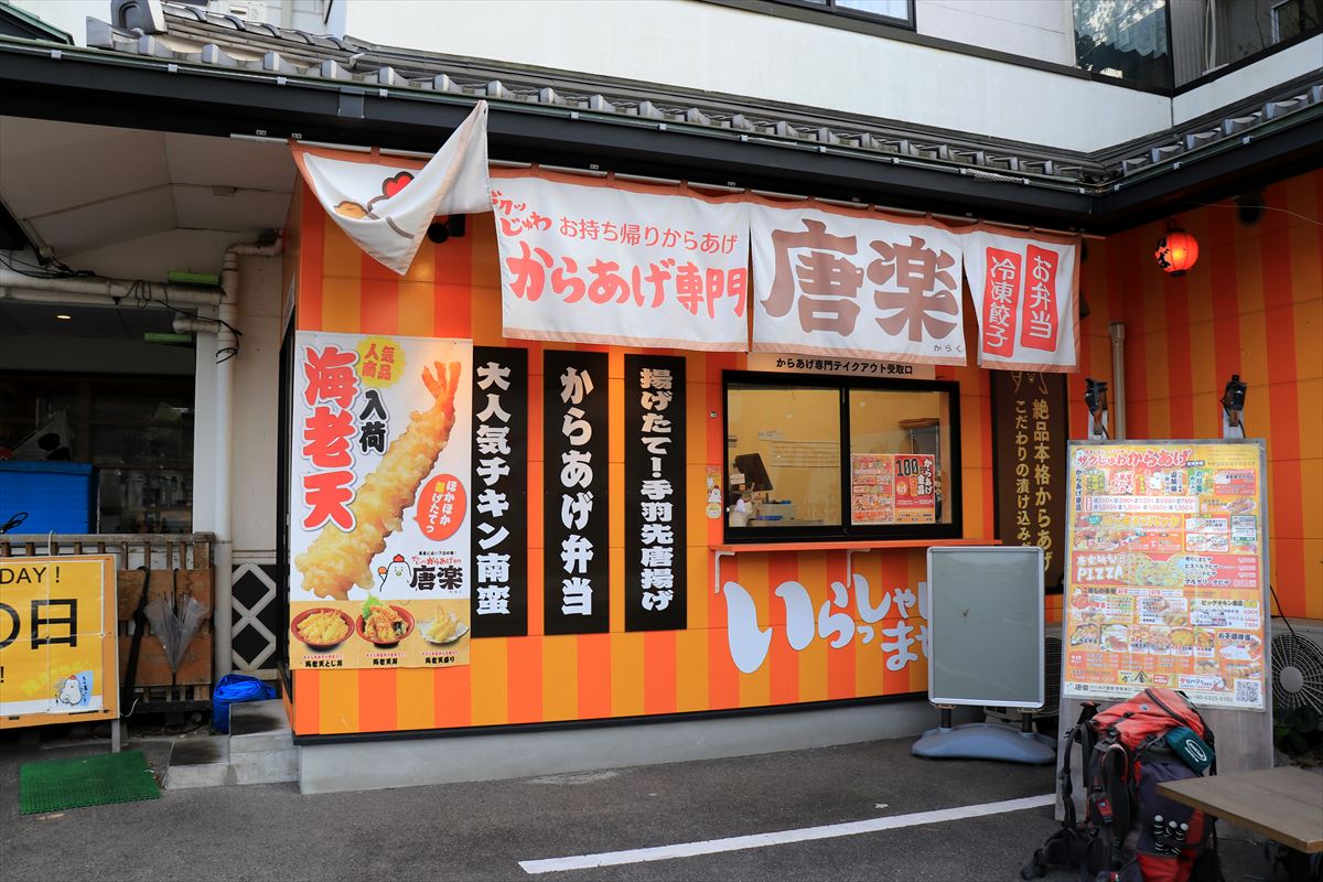 返却時間の5分前というギリギリのタイミングで自転車を返した後に更に食料調達。つまみは調達したものの主食となるものが無いので、駅隣接の唐楽という唐揚げ屋で弁当を購入しました。