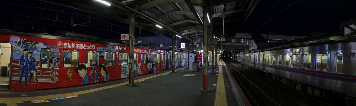 米子駅ホームの風景。実質、4方面に分岐するジャンクション駅という事で構内には様々な方面に向かう列車が並びます。左が乗車する鳥取行きの普通列車で、名探偵コナンのラッピングが施されてました。