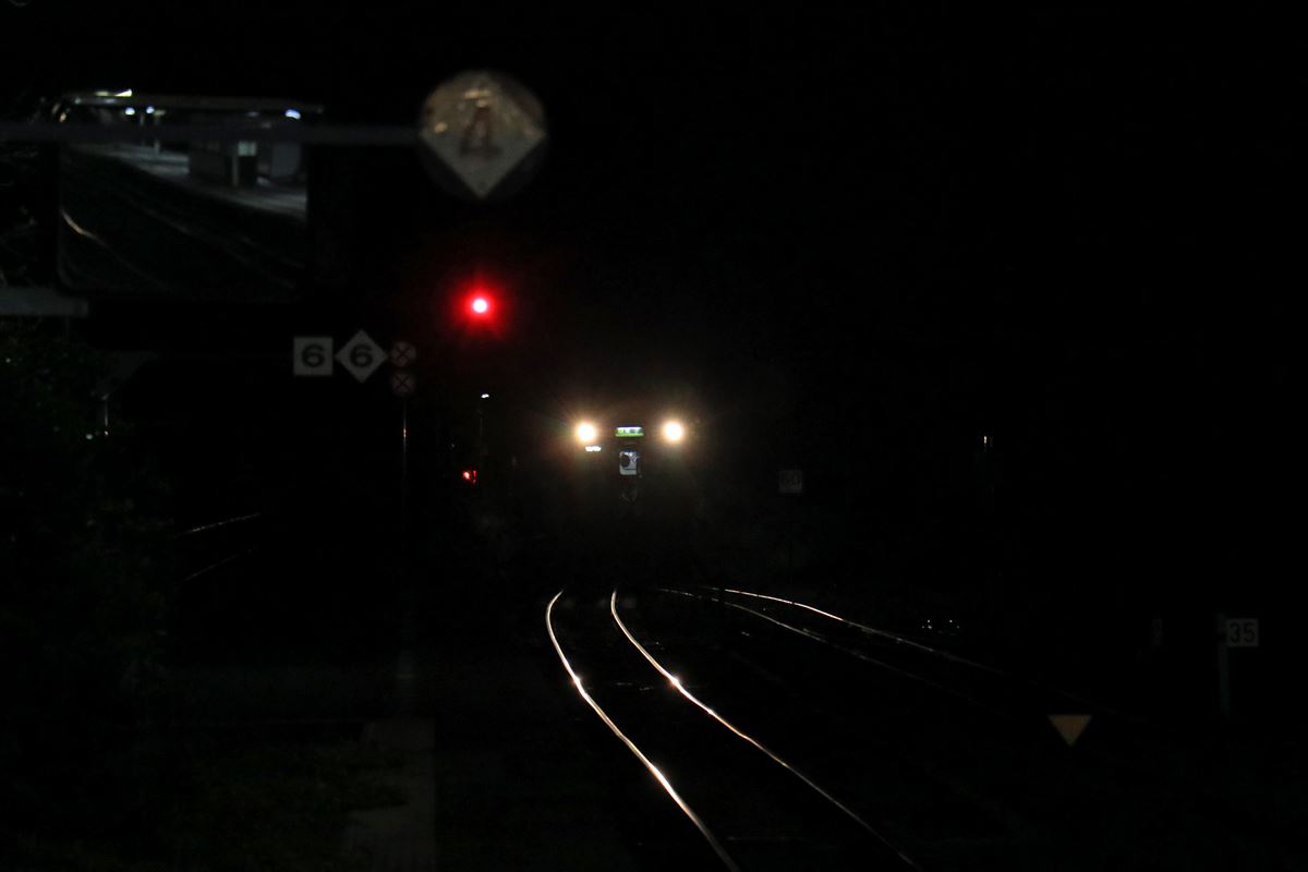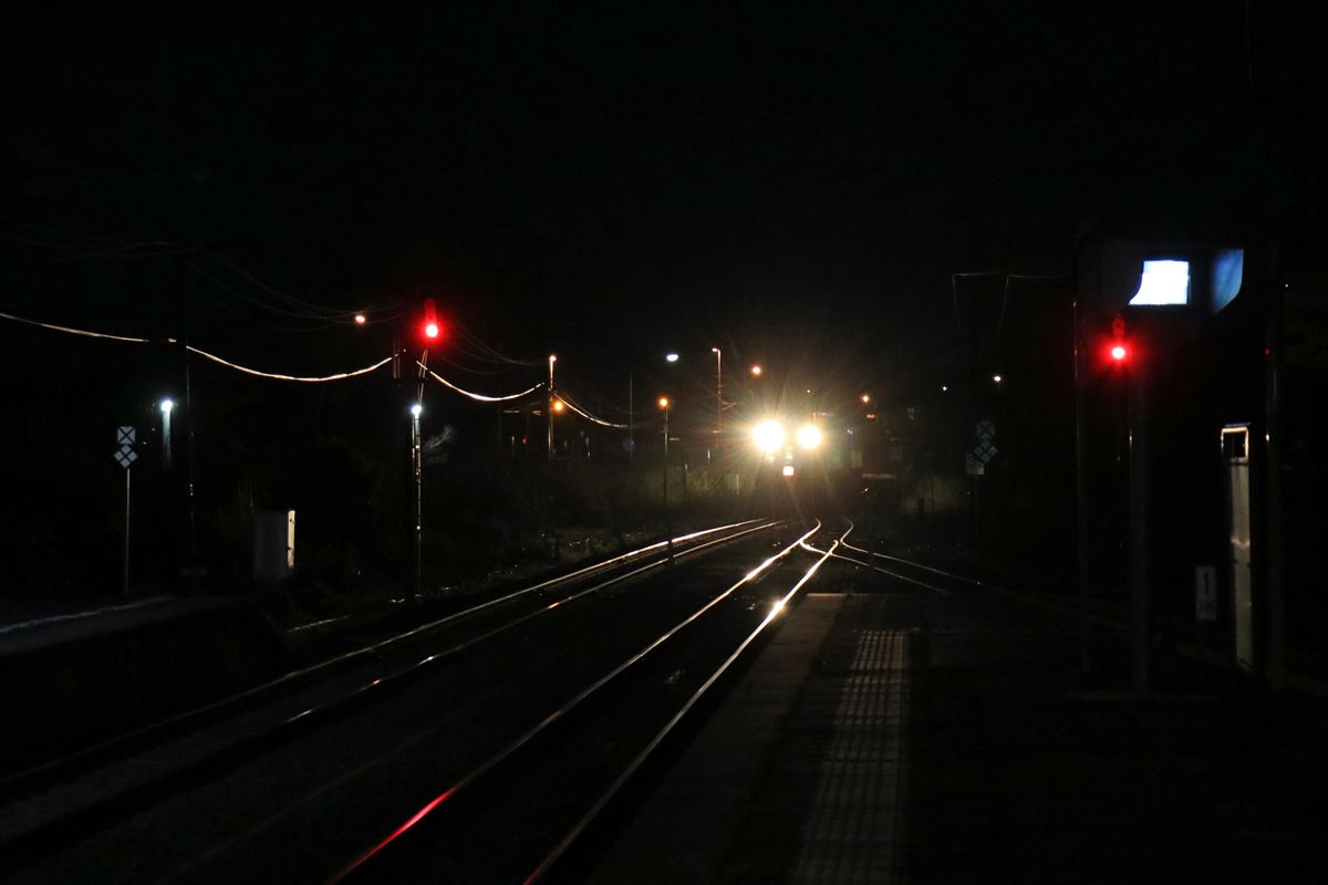 反対側からやってきた特急列車。前照灯に照らされたレールが眩しく輝く。