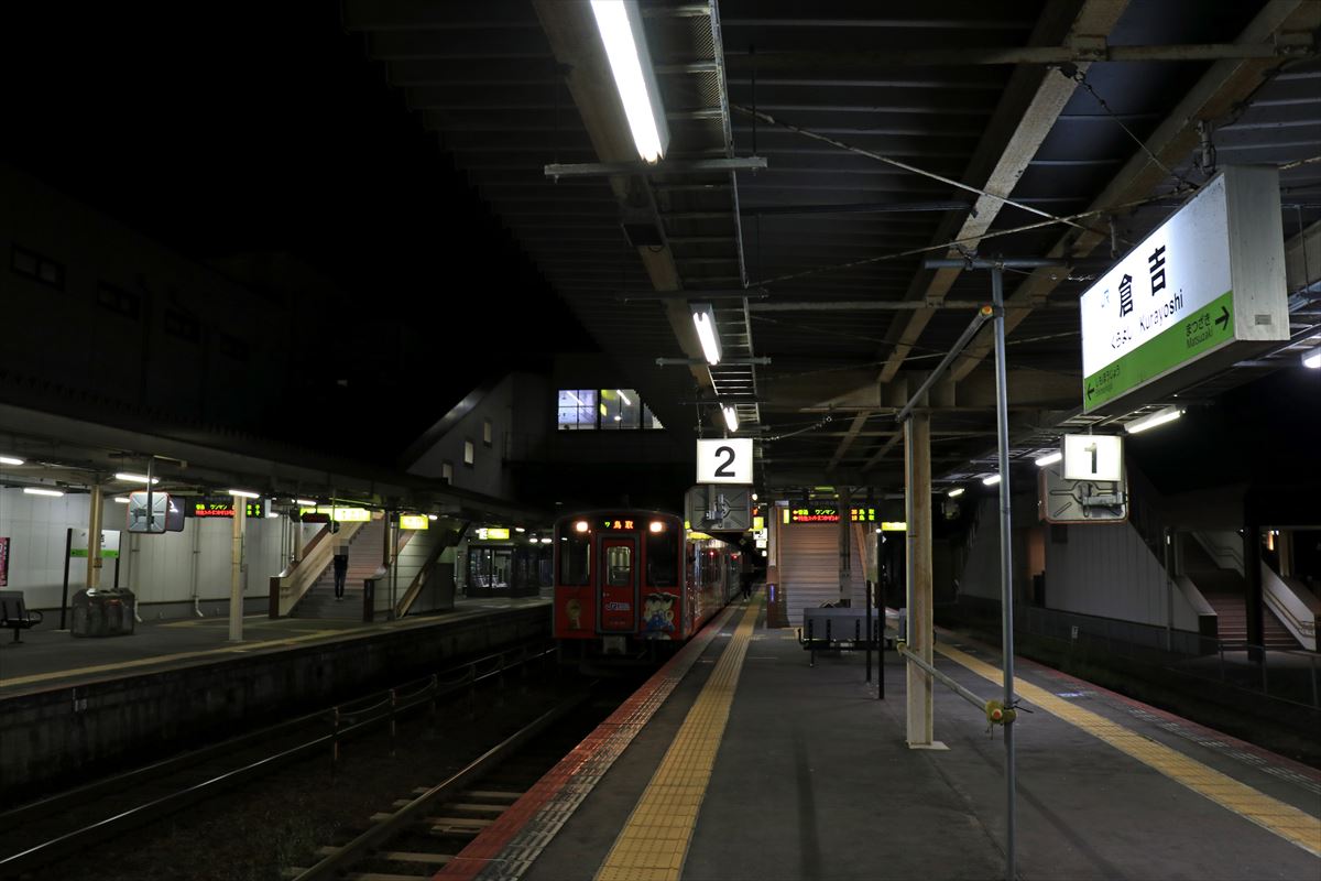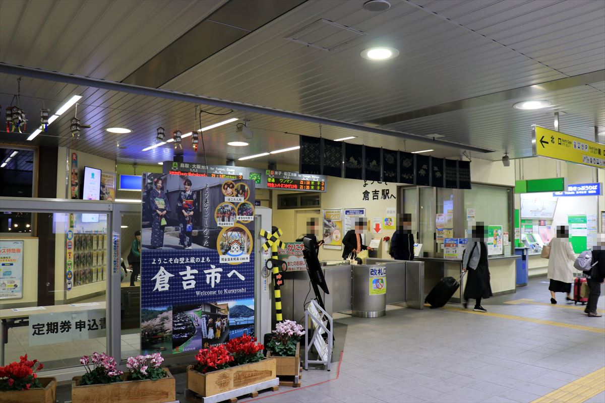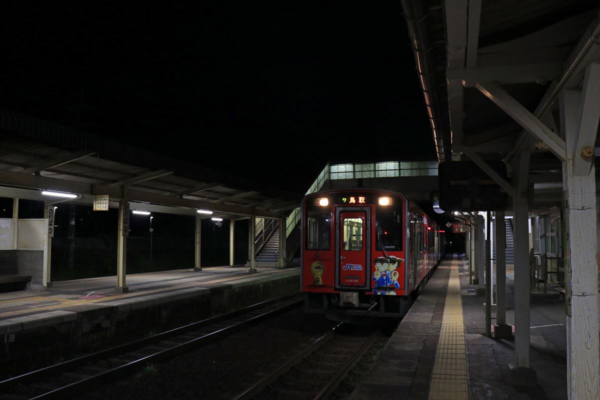 倉吉駅で下車しました。県内では鳥取と米子に次ぐ規模の都市の中心駅なんですが、夜間とは言え無人化されていたのにちょっと驚きでした。