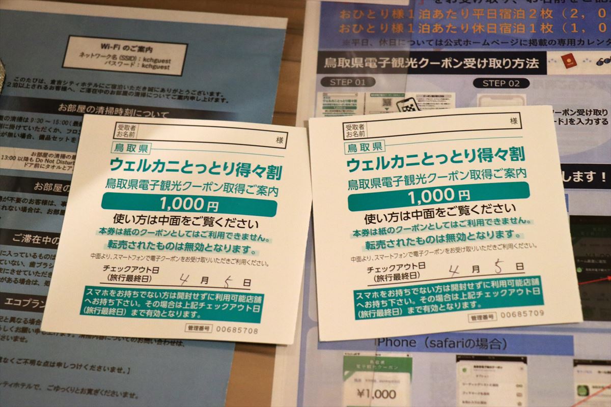 宿にチェックインする際に貰ったクーポン券です。旅行した当時の2023年の4月は全国旅行支援の施行中で、宿泊料金が割引される上にこんな感じのクーポン券(2000円分)が貰えました。