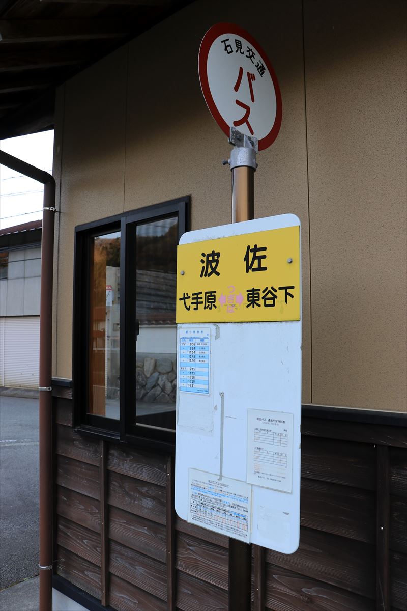 前日下車した波佐バス停に戻りました。浜田の中心市街方面に向かう路線バスは1日5往復と、山間地域の路線バスにしてはそれなりに本数がある方かと。