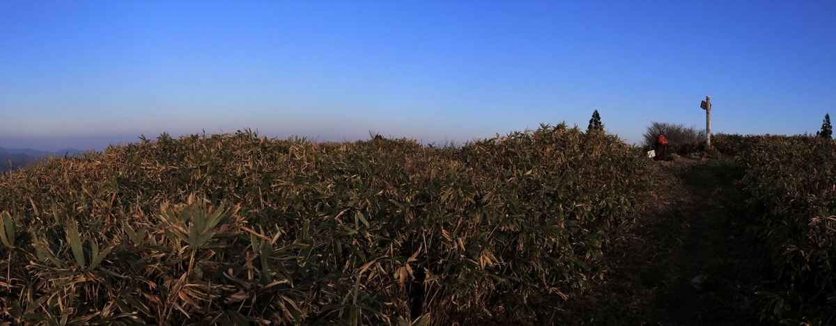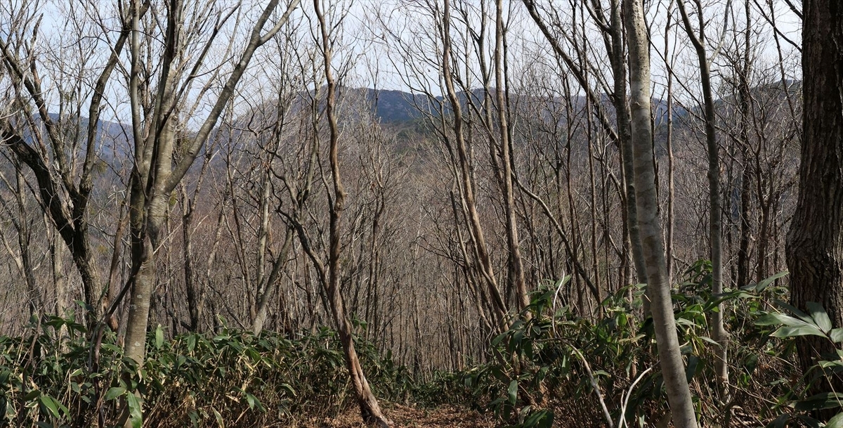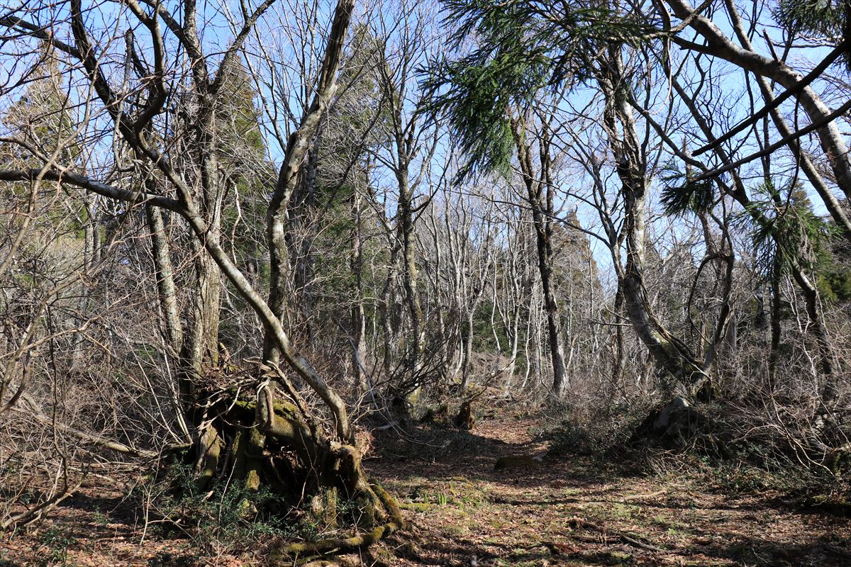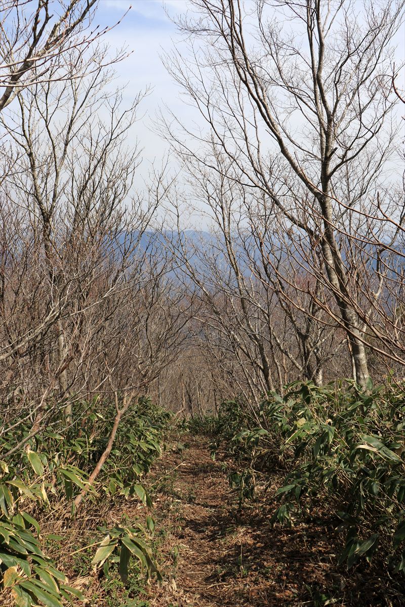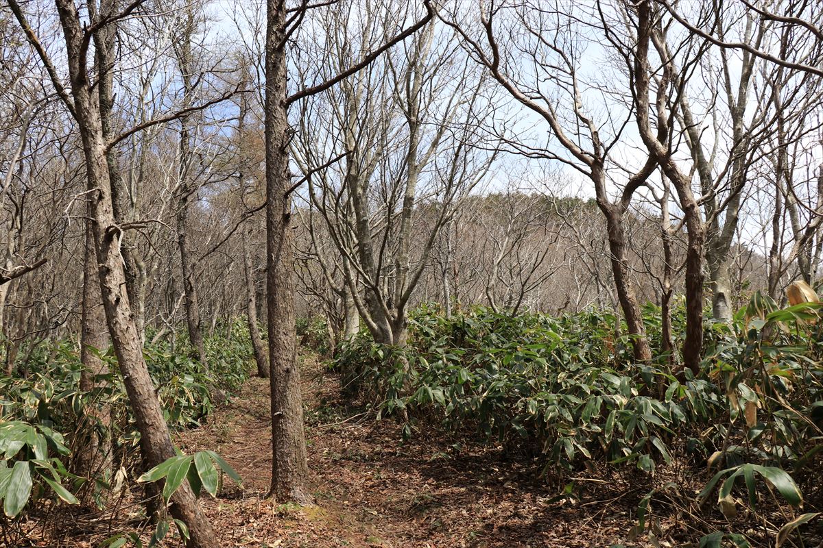 十方山の山頂周辺と同様、樹林帯の中に笹が生い茂る風景が広がる。