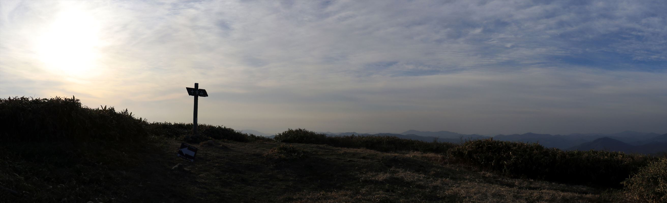 長い林道歩きを経て十文字峠に到着。距離としては2km強という所でしたが、曲がりくねっている上に意外とアップダウンがあり餅ノ木峠から2時間掛かりました。時間は既に夕刻という事で太陽は傾きつつある。