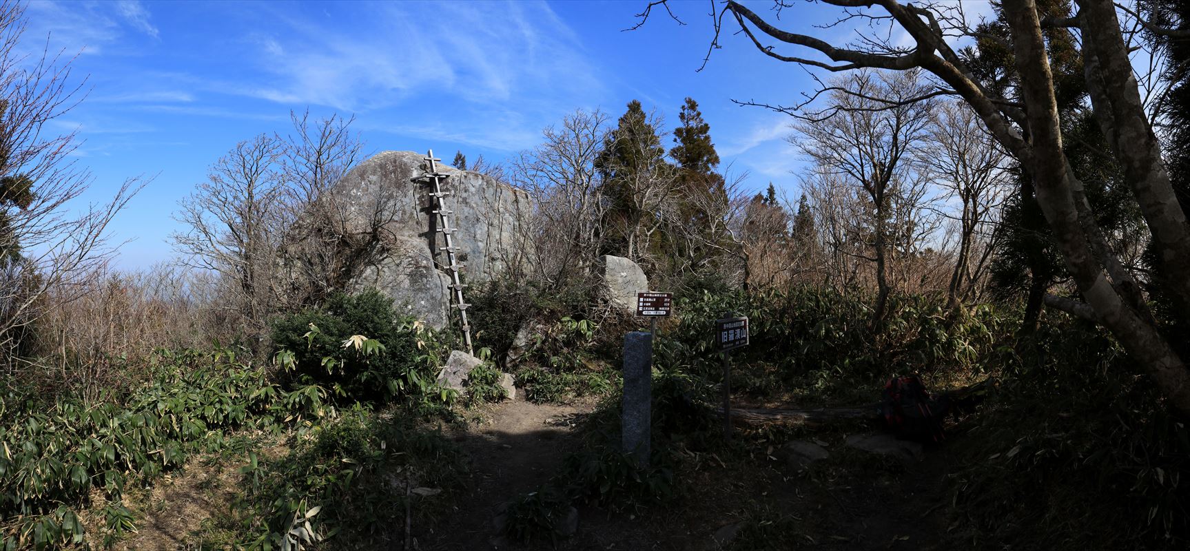旧羅漢山の山頂風景。大きな岩があり、そこに何やら心許なそうな梯子が立て掛けられています……梯子は殆ど見た目通りのイメージのもので、固定されていない為か足を掛ける度にぐらぐら揺れて恐怖でした。