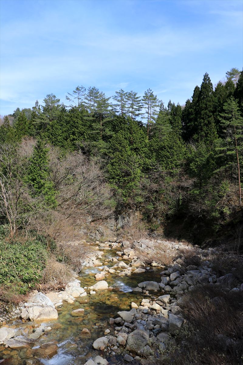 橋の上から田代川を見下ろす。奥三段峡と呼ばれるエリアのようで、そのまま下流に向かうと著名な三段峡に行き着くようです。今回は沢沿いには歩きませんでしたが、そちらから聖湖に向かうルートも候補の一つでした。